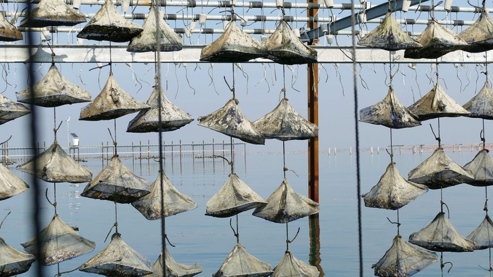 Il sistema di coltivazione decisamente particolare ed esclusivo è stato ideato da Florent Tarbouriech, produttore delle famose ostriche rosa nel bacino di Thau, la maggiore laguna della regione della Linguadoca-Rossiglione nel sud della Francia; area conosciuta anche per la grande produzione di vini, i più apprezzati sono il Vin de Pays d’Oc e il frizzante Crémant de Limoux.