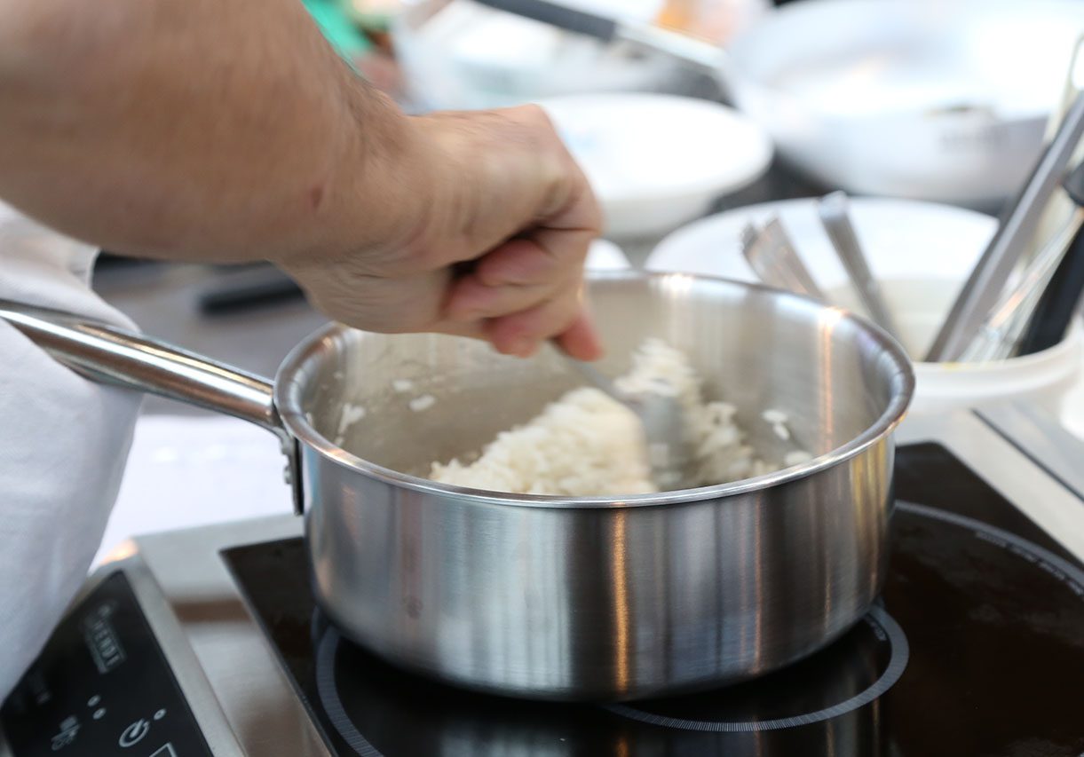 Tenere il riso nell’acqua per un paio d’ore, poi far fare un bollore sul fuoco; coprire il tegamino con un foglio d’alluminio e finire in forno a 180°C per 10 minuti.