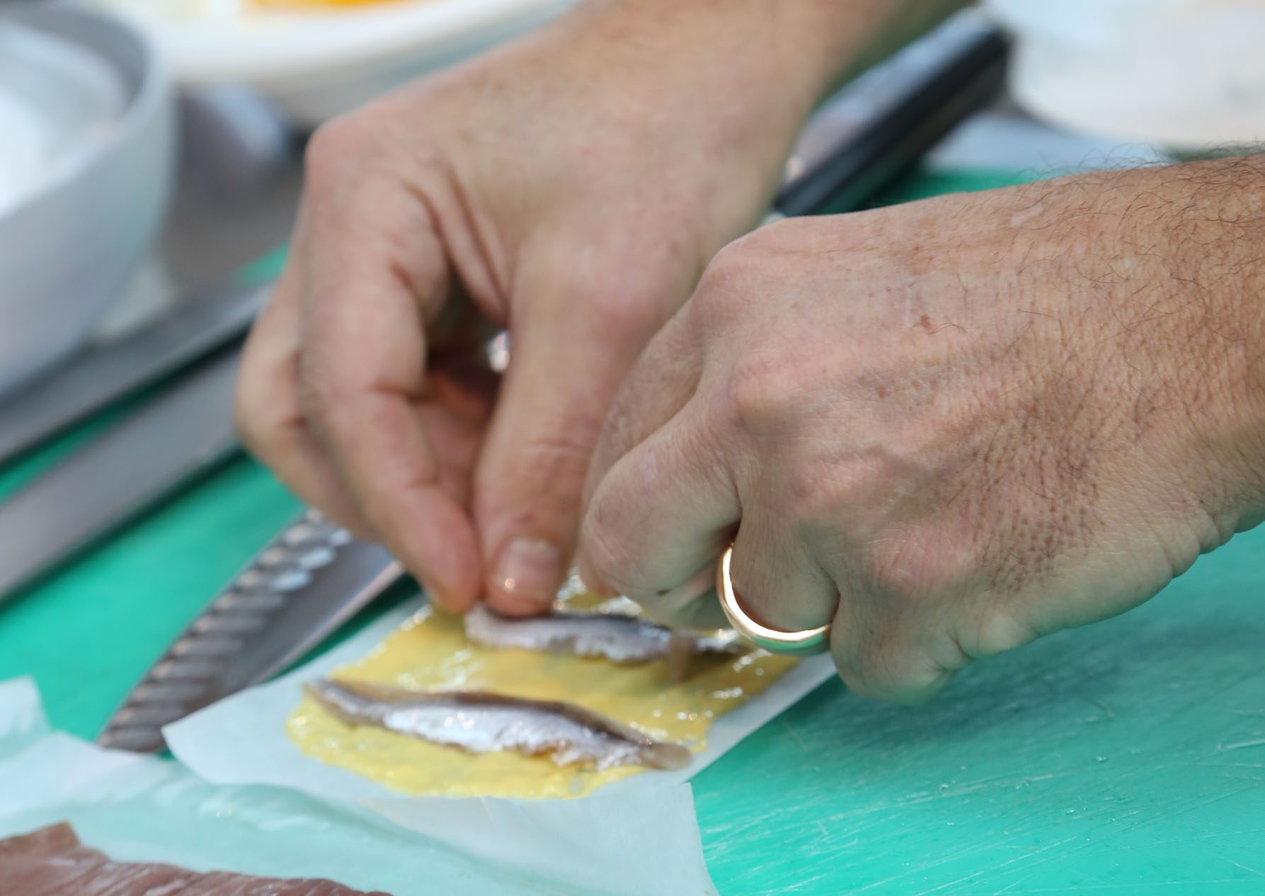 Per la pastella: mescolare velocemente con la frusta tutti gli ingredienti e far lievitare per circa 20 minuti, poi posizionarne 20 grammi in un rettangolo di carta da forno di cm. 14×8, aggiungendo un’acciuga per foglio. Portare l’olio a 160°C e versare la carta con la pastella che, come prenderà calore, si staccherà.