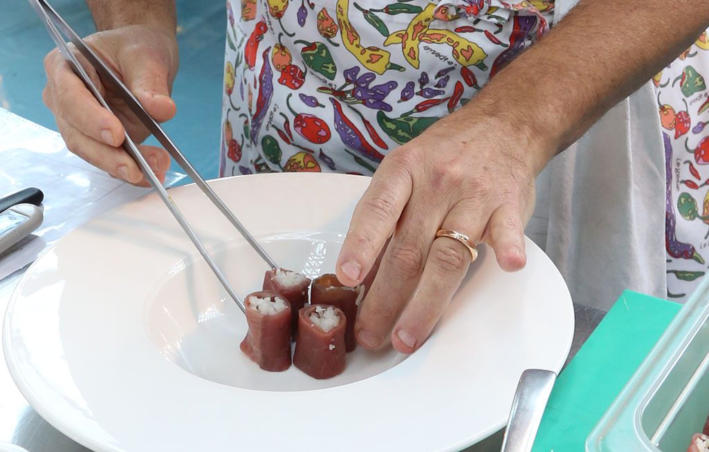 Prendere la fetta di fassona di circa 30 grammi, mettere al centro 15 grammi di riso susci, ed arrotolare a mo’ di maki; tagliarlo in 4.