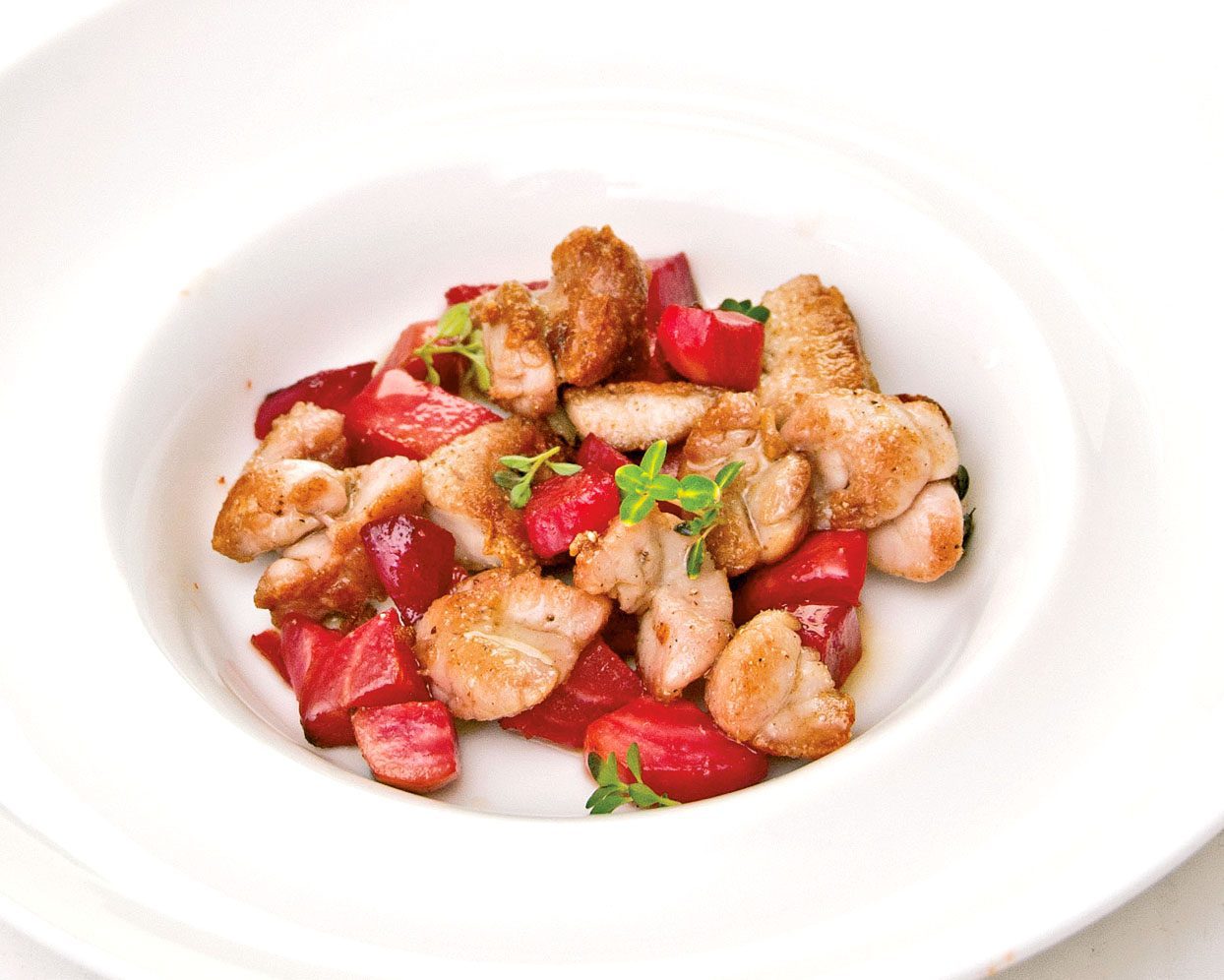 In un secondo momento, sgocciolare e sgranare le animelle e rosolarle in padella col burro chiarificato, lo spicchio d’aglio in camicia e i rametti di timo limonato.