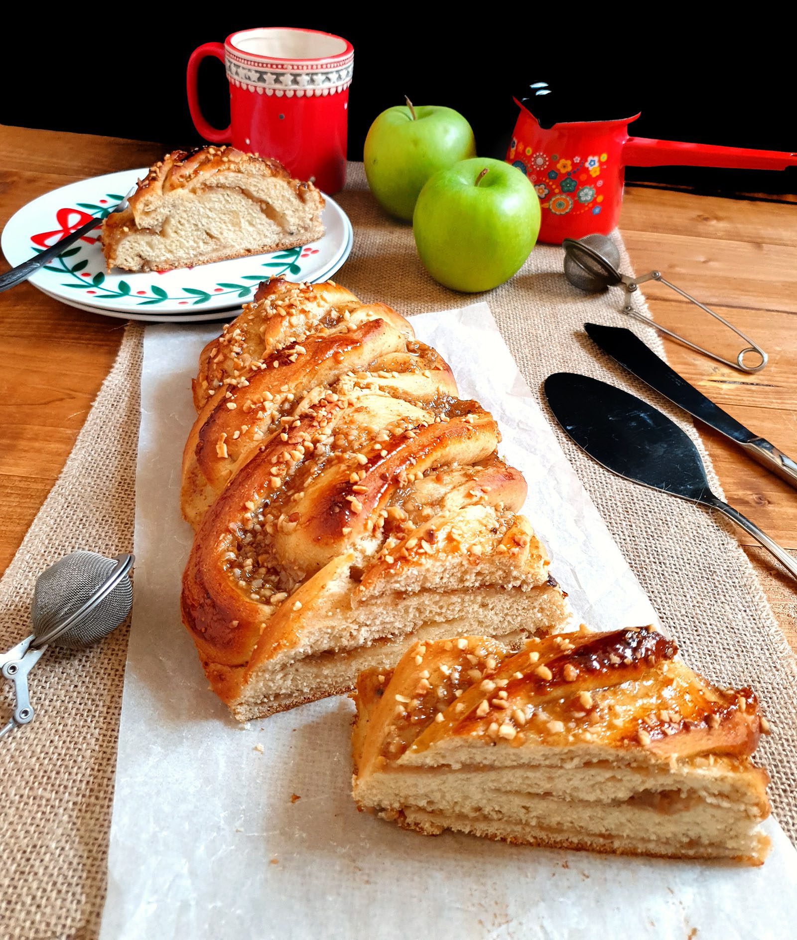 Tagliare il rotolo a metà nel senso della lunghezza e intrecciare con la parte interna a vista. Ripetere la stessa cosa per l’altro panetto.