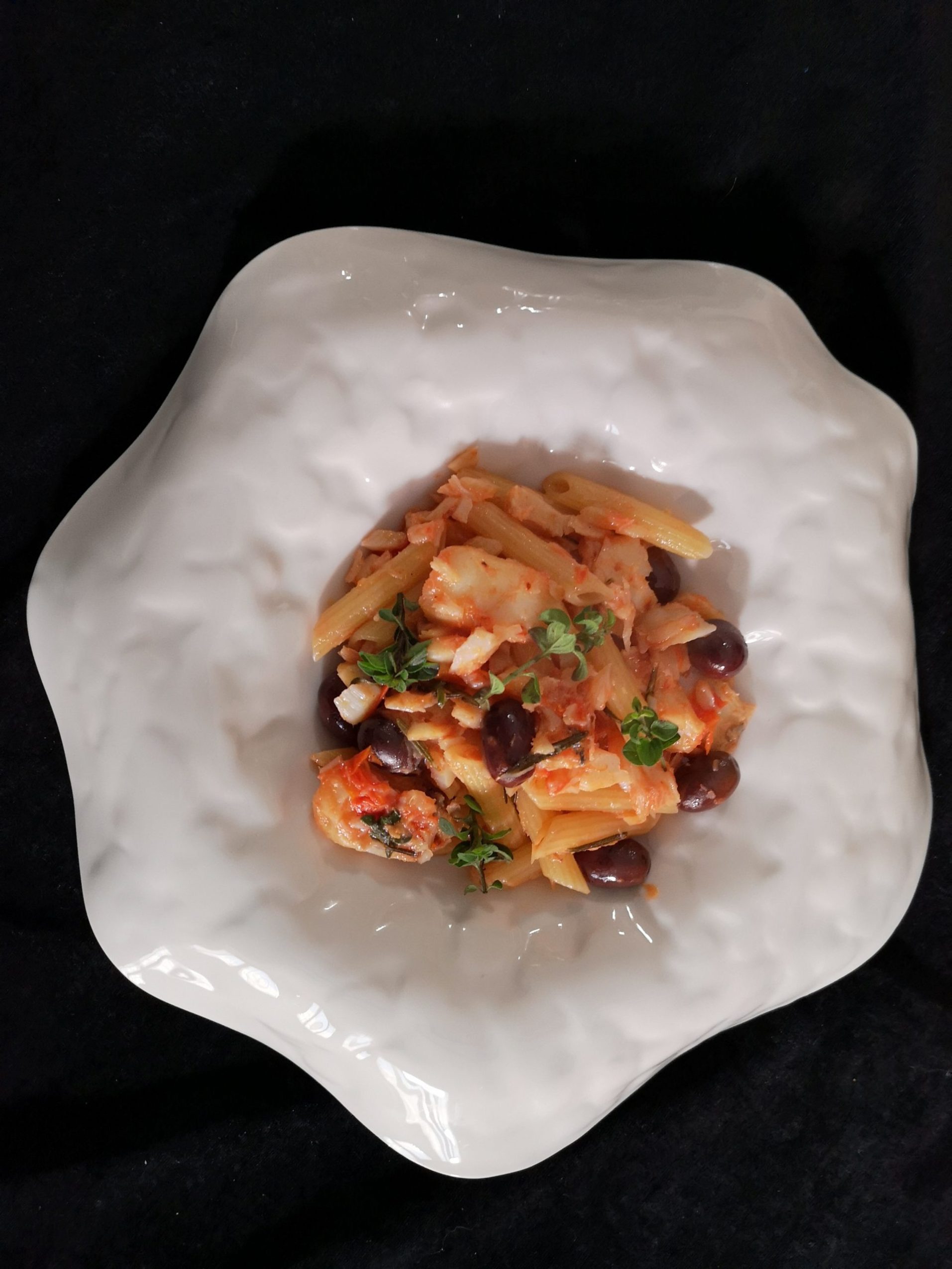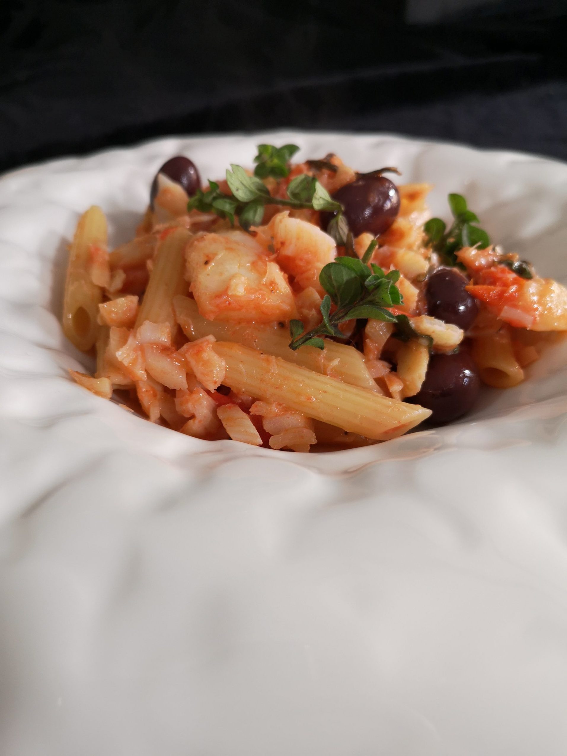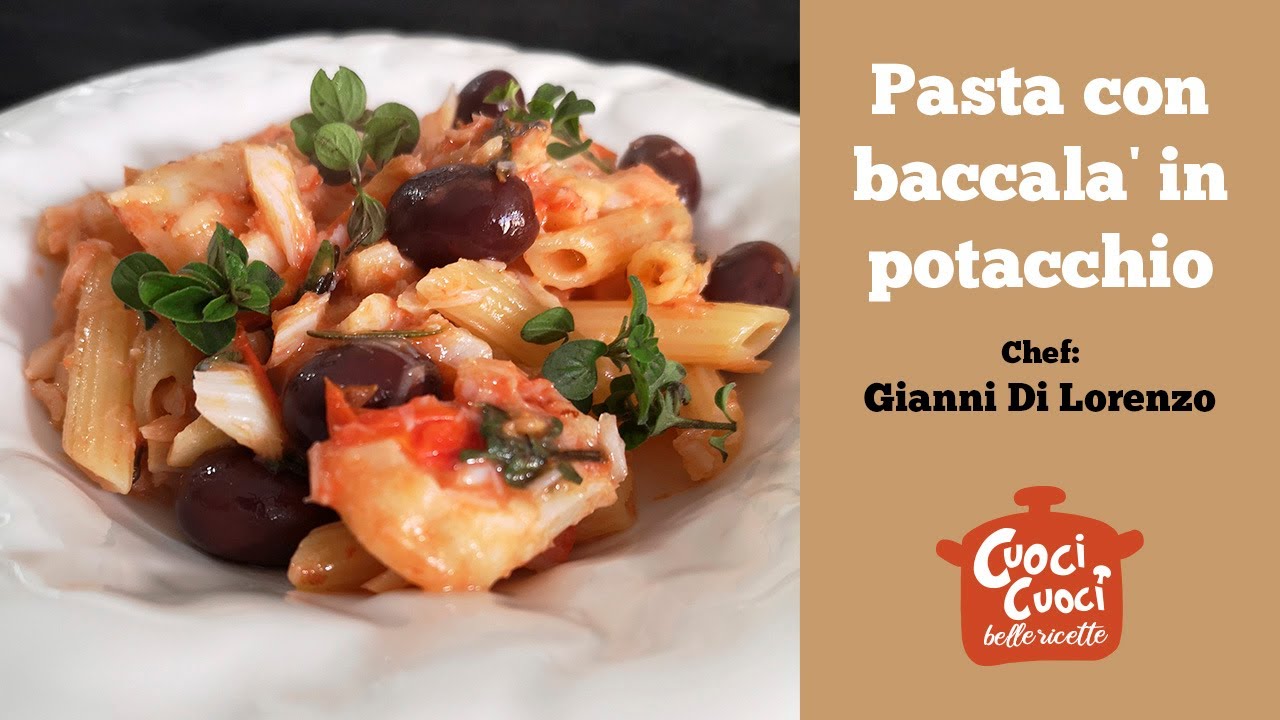 Oltre che un secondo piatto gustoso, il baccalà in potacchio, ridotto in pezzi più piccoli, può divenire, come in questo caso, un ottimo condimento per la pasta, magari con l’aggiunta di olive nere e timo fresco.