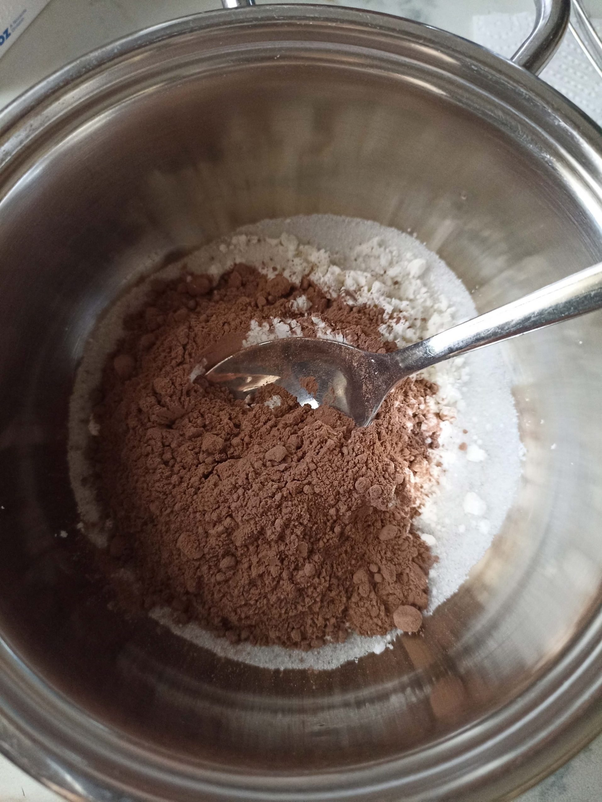 In un tegame mischiamo insieme lo zucchero, il cacao zuccherato e l’amido di mais.