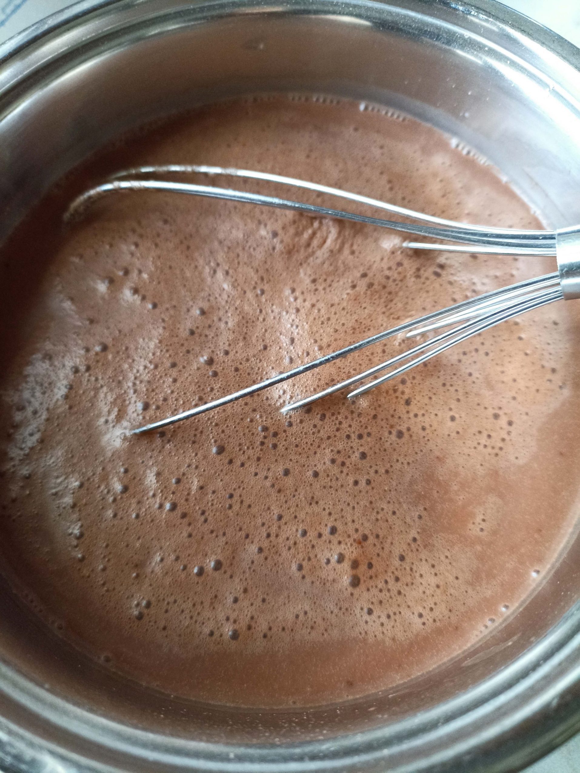 Portiamo il tegame sul fuoco e, sempre mescolando con l’aiuto della frusta, portiamo a bollore il composto.
