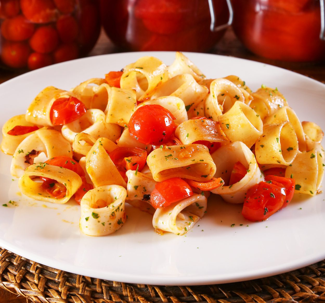La calamarata è un delizioso primo piatto di mare tipico della cucina napoletana. Questa pasta viene condita con un sugo a base di calamari e pomodorini, ingredienti semplici ma che rendono questo piatto super saporito e gustoso.