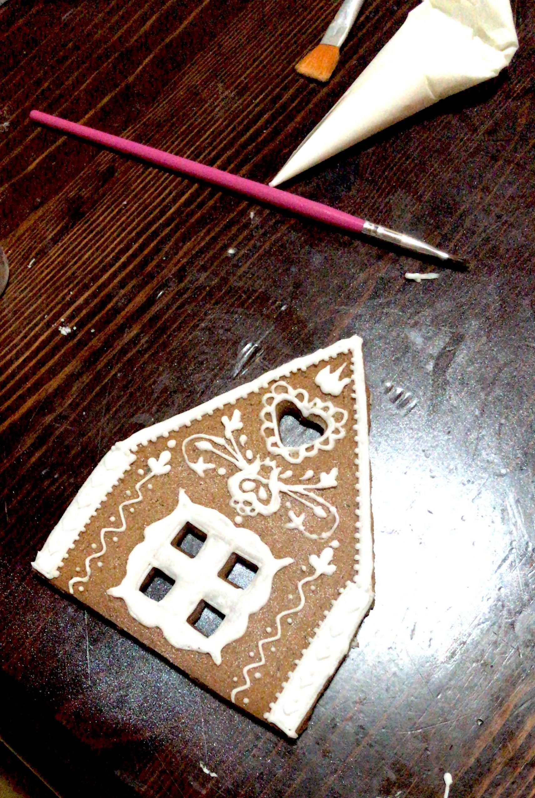 Iniziare decorando a piacere le quattro pareti della casetta e aspettare che la ghiaccia si indurisca.