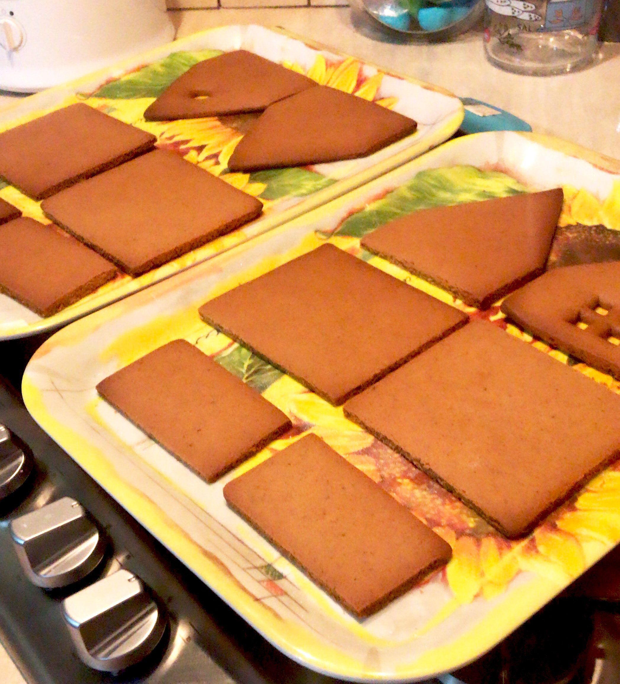 Prendere dei fogli di carta e ritagliare le parti della casetta di pan di zenzero che verranno poi utilizzate come sagome per l’impasto. Servirà una sagoma per il tetto, una sagoma per la parete lunga e una sagoma per la parete corta. Quindi porre le sagome sopra l’impasto steso e con l’aiuto di un coltello tagliare lungo i bordi. Si dovranno ottenere in totale sei parti: due per il tetto, due per la parete lunga e due per la parete corta. A questo punto è possibile anche ricavare le finestre o la porta nelle pareti della casetta.