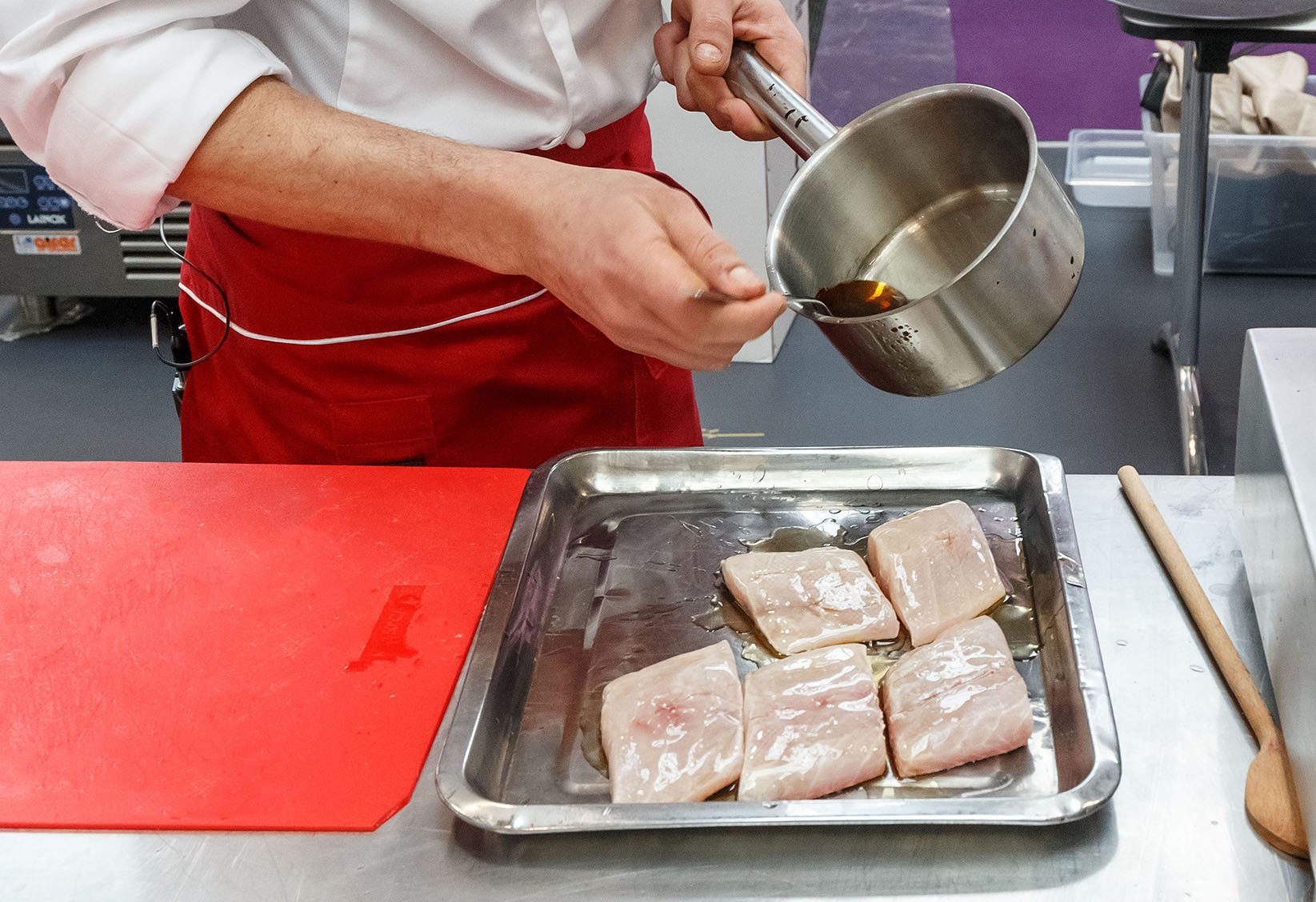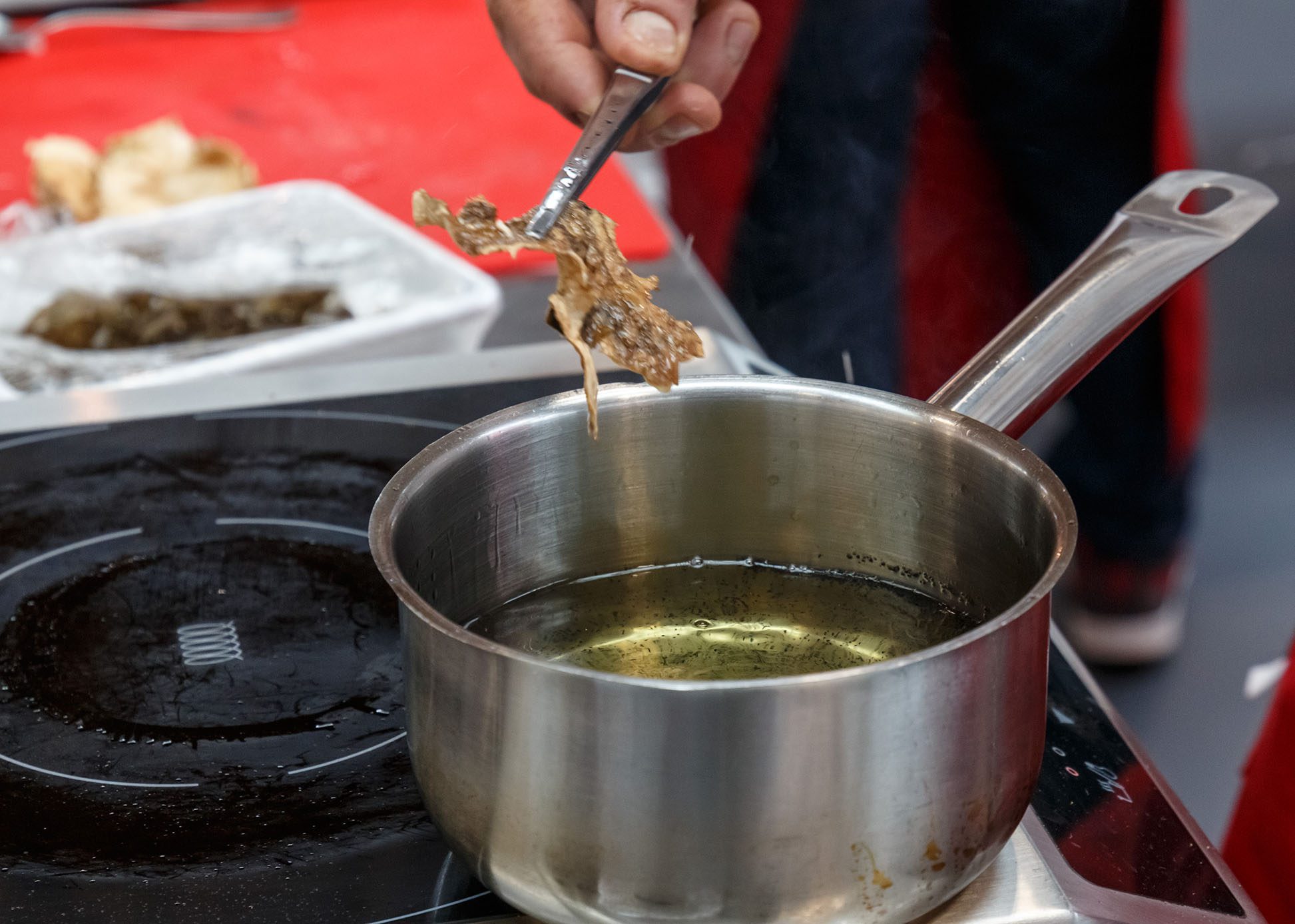 Infine, prendiamo un padellino per far scaldare l’olio di sesamo fino a raggiungere 170°/180°C e versare sul filetto di cefalo l’olio di sesamo bollente.