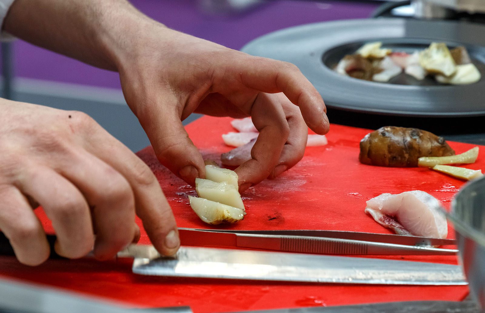 Per l’impiattamento disporre la crema di topinambur su un piatto, i filetti di cefalo, le bucce dei topinambur precedentemente fritte, la polvere di cipolla bruciata e i funghi Cardoncelli.