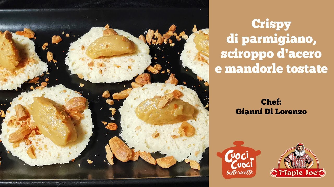 Le chips di parmigiano, servite con una quenelle di mandorle e sciroppo d’acero, sono un antipasto semplicissimo da preparare ma davvero ottimo e saporito.