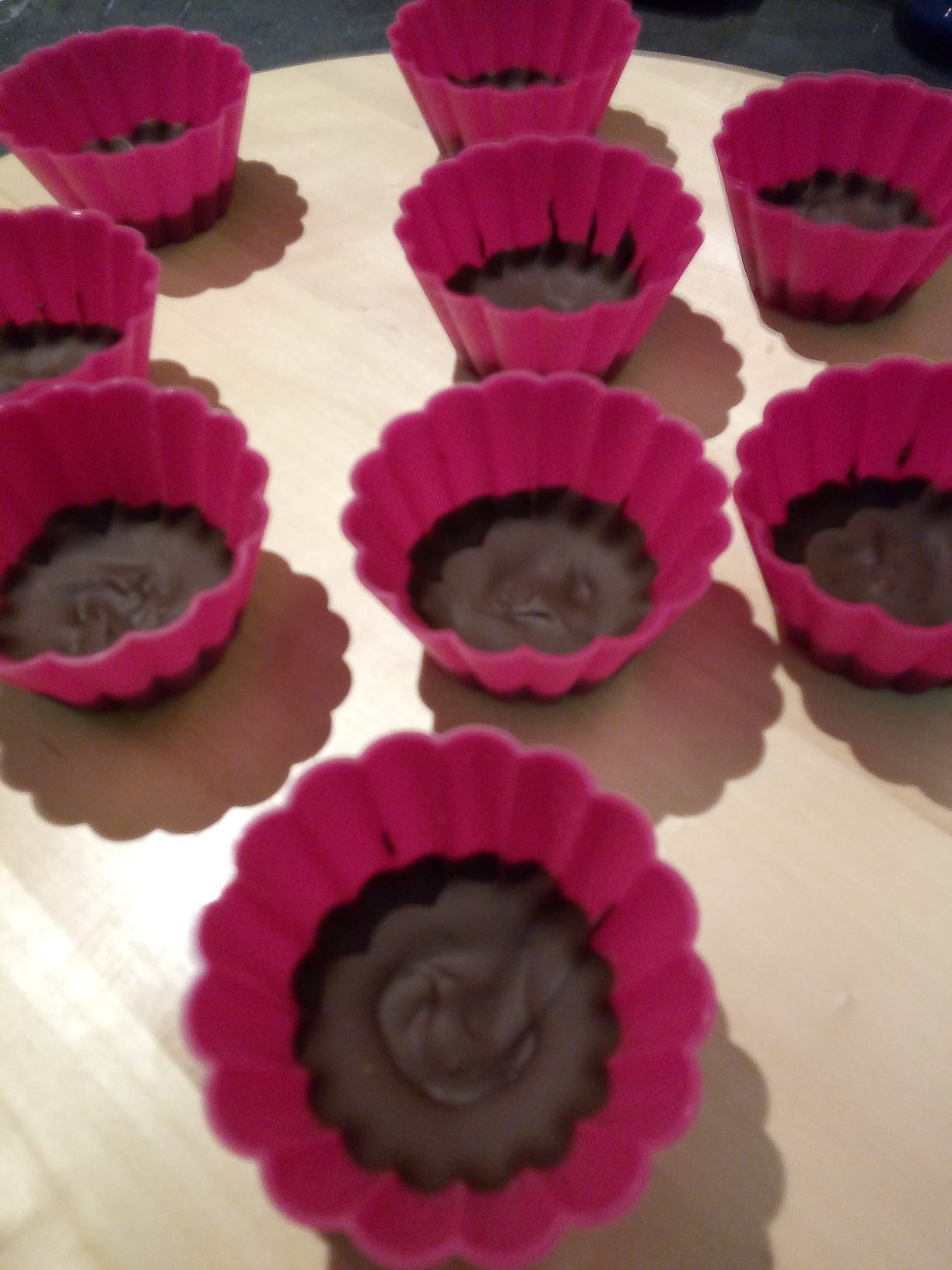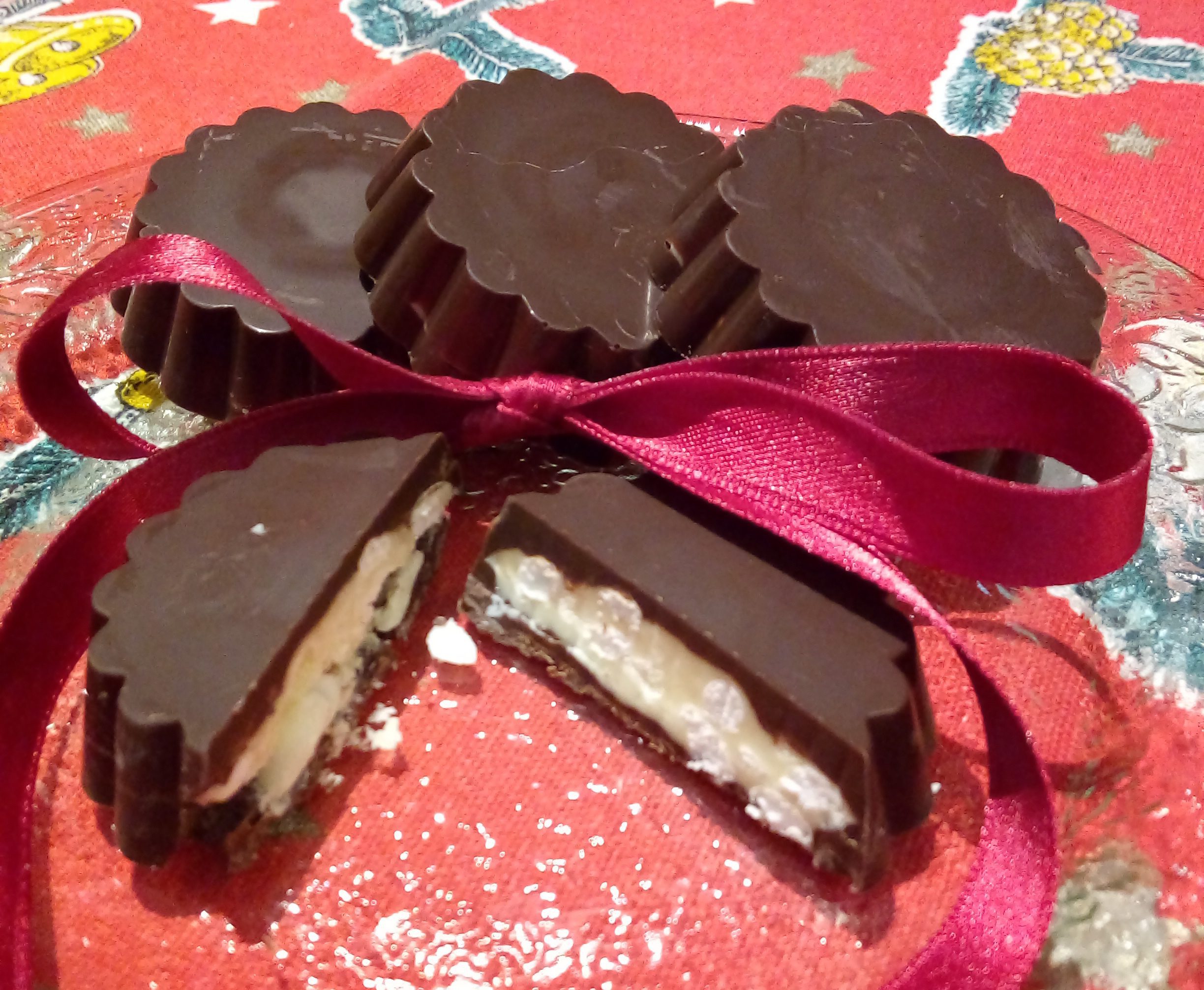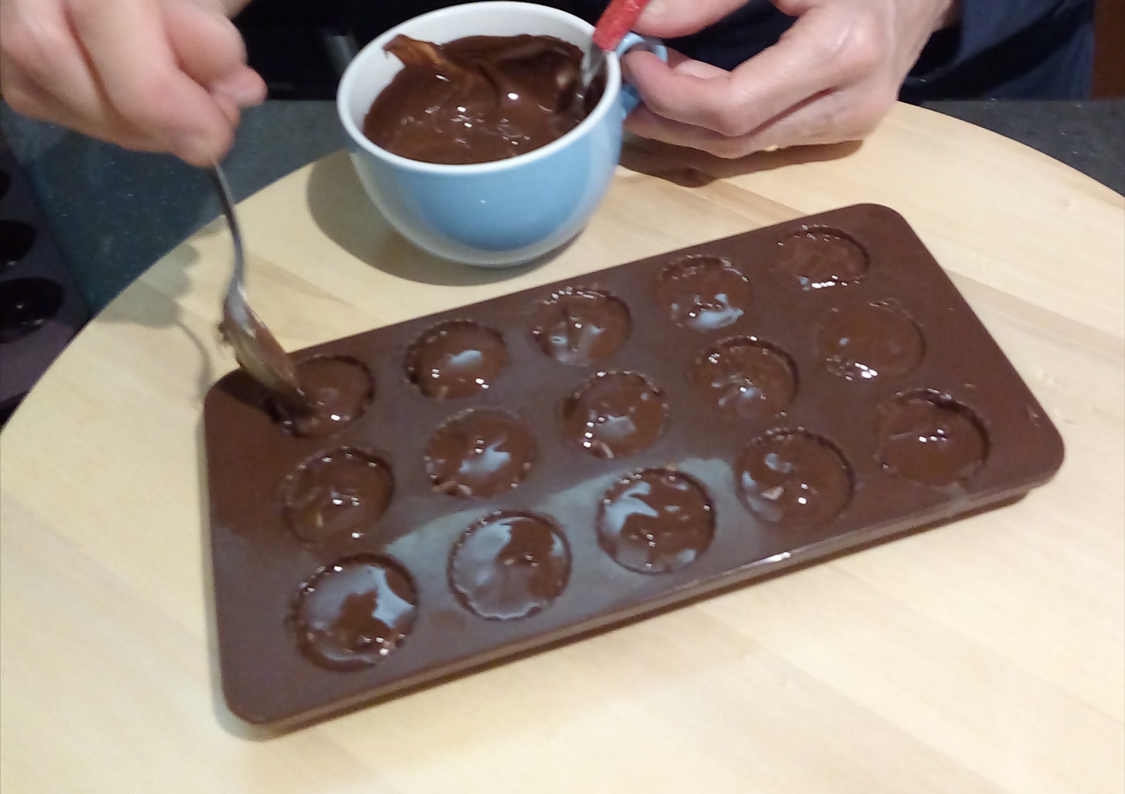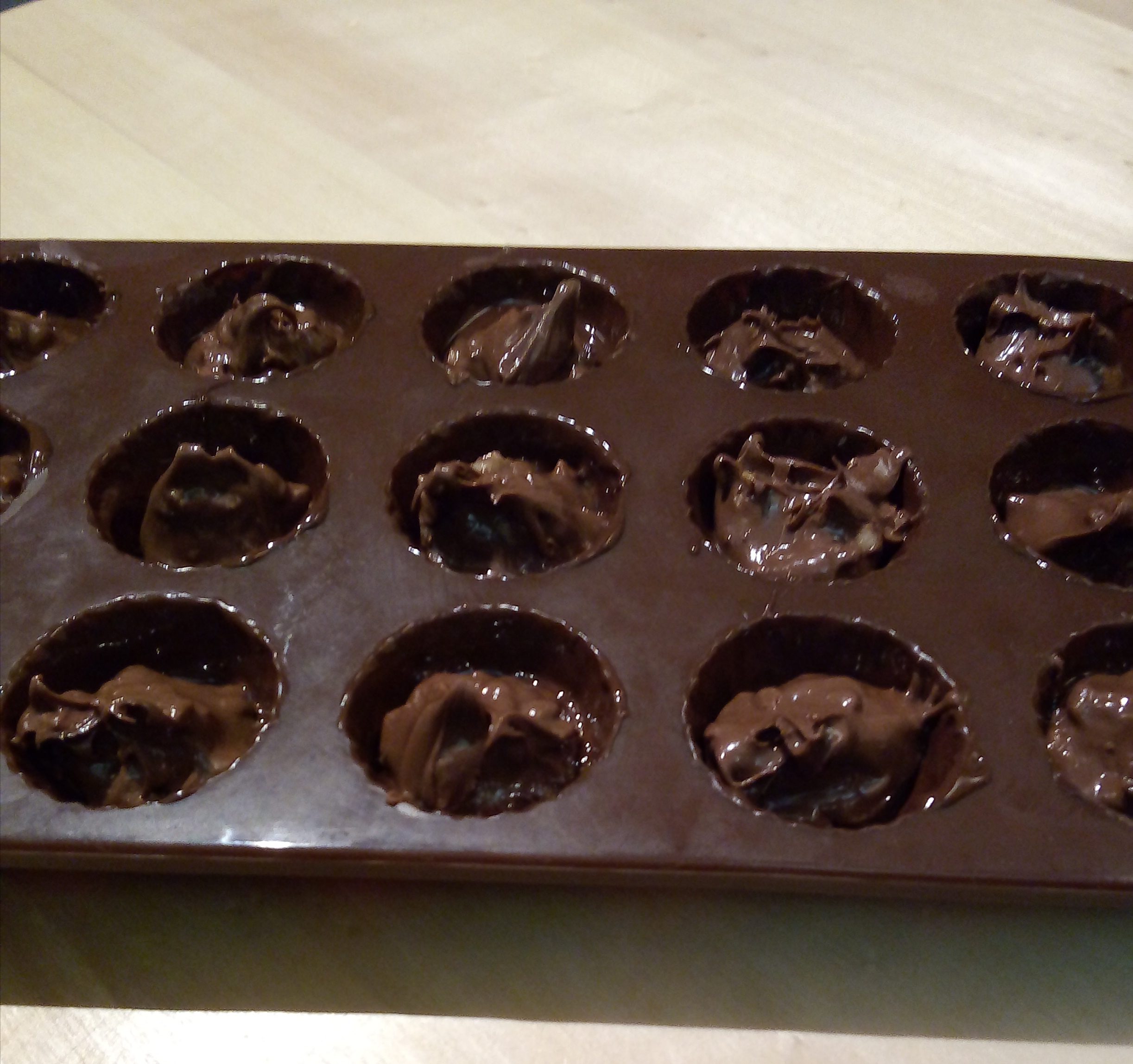 Ricoprite con altro cioccolato fondente e scuotendo delicatamente livellateli senza farli sbordare.