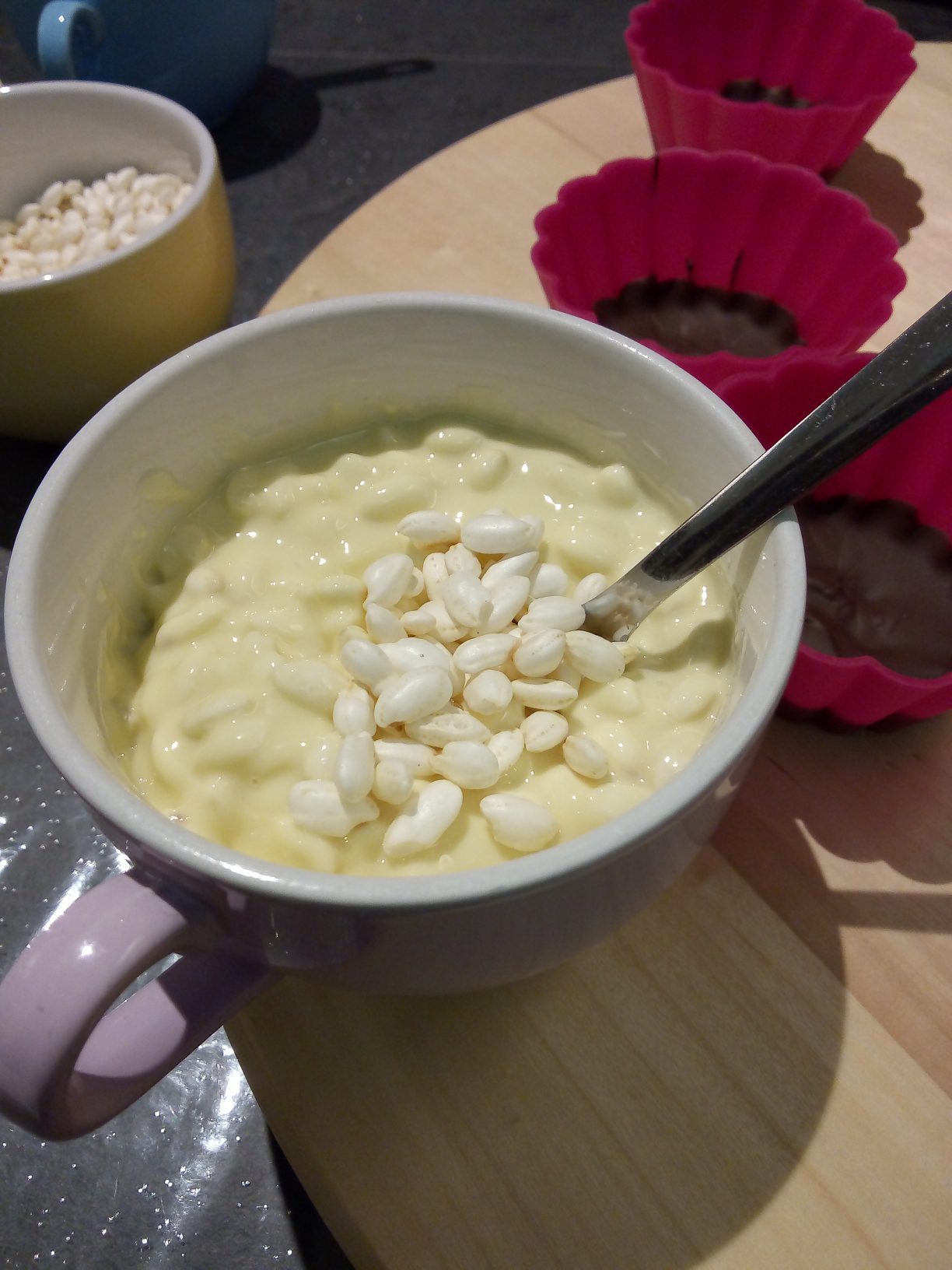Nel frattempo sciogliete 100 grammi di cioccolato bianco e mescolatelo al riso soffiato.