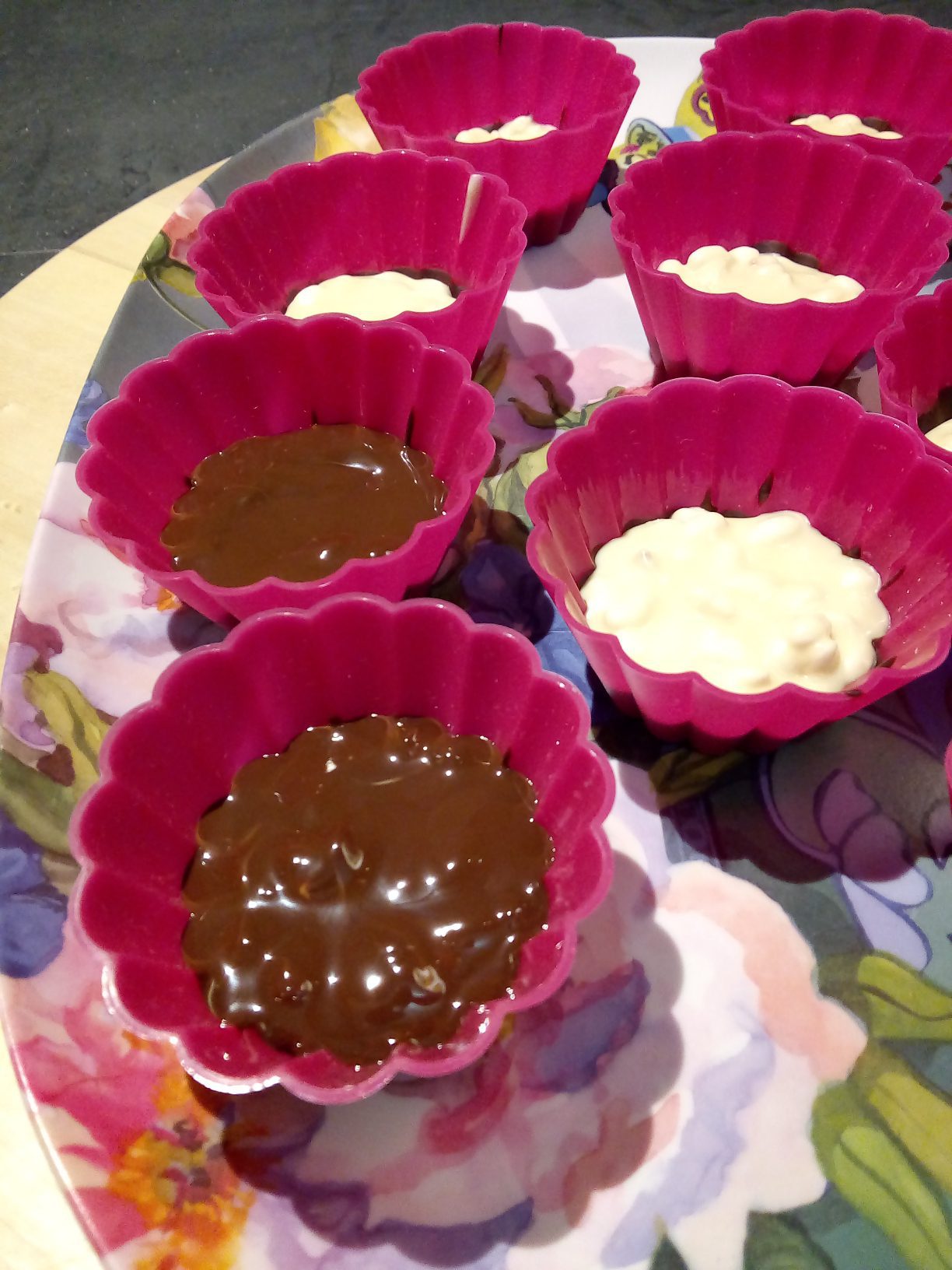 Trascorso il tempo necessario, riprendete gli stampini, versate l’ultimo strato di cioccolato fondente fino a coprire completamente lo strato bianco.