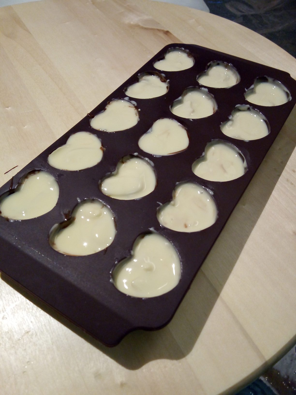 Sciogliete 100 grammi di cioccolato bianco e procedete come per gli altri cioccolatini.