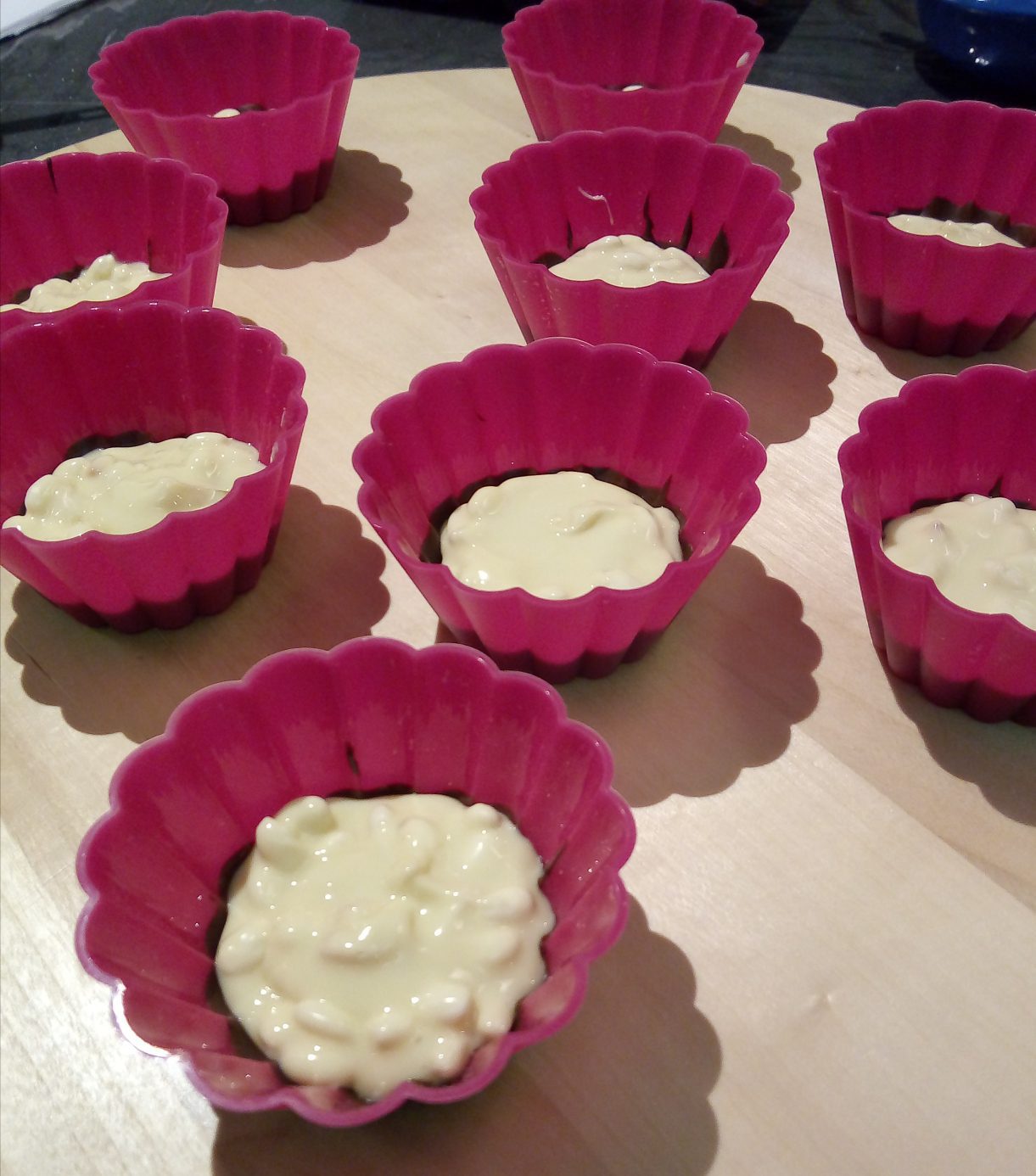 Riprendete i pirottini, versate un cucchiaino di cioccolato bianco e riso e rimettete nuovamente in frigorifero finché non si sarà rappreso.