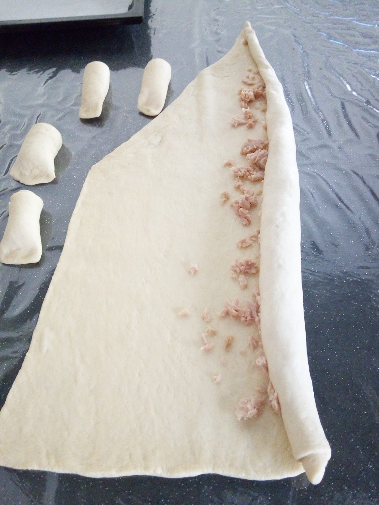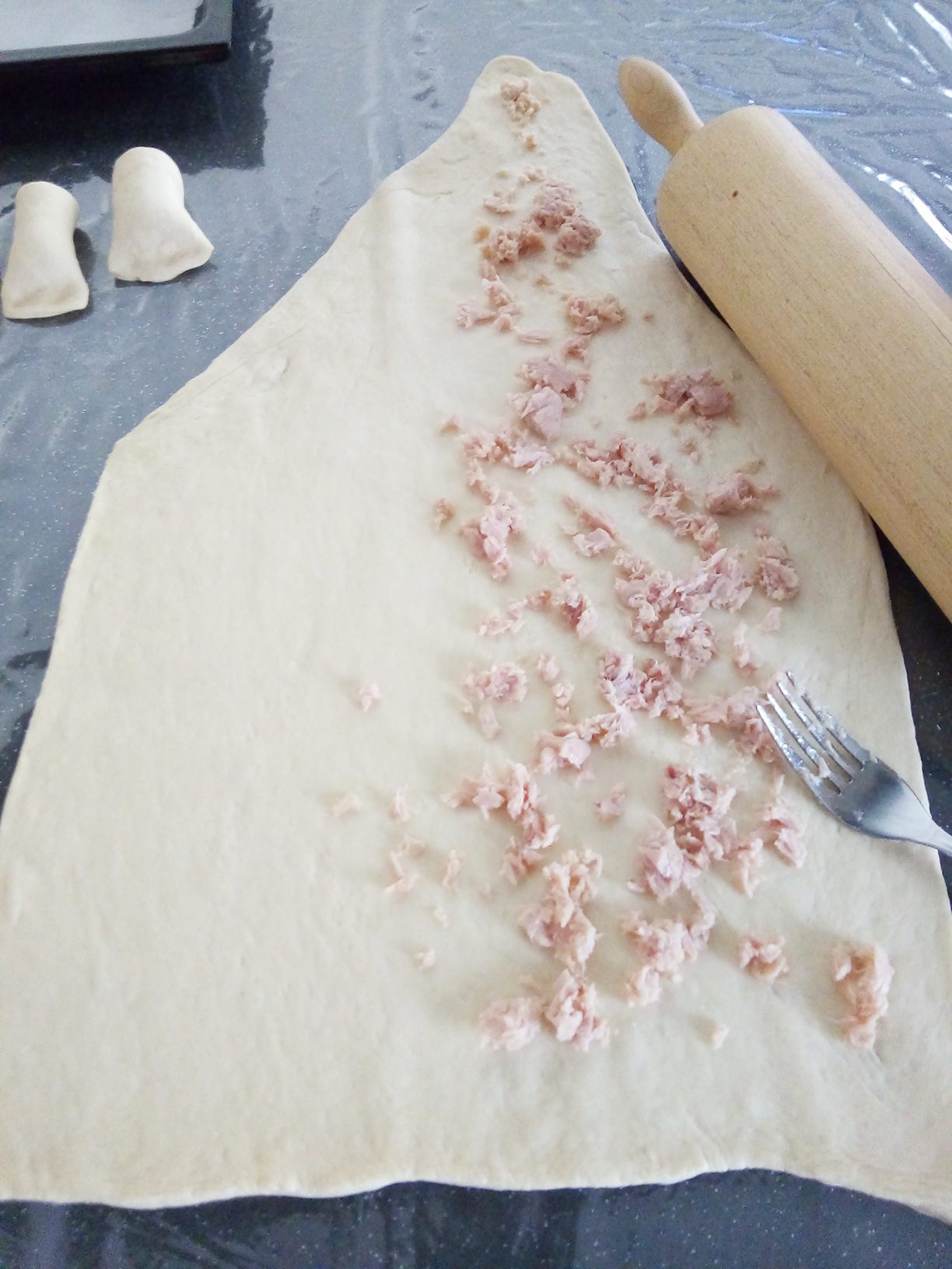 Farcire la sfoglia a piacere (nel mio caso ho usato del tonno), iniziare ad arrotolare lateralmente la sfoglia e formare un filoncino con la punta ad una delle estremità, questa sarà la coda del coccodrillo, mentre l’altra estremità sarà il muso.