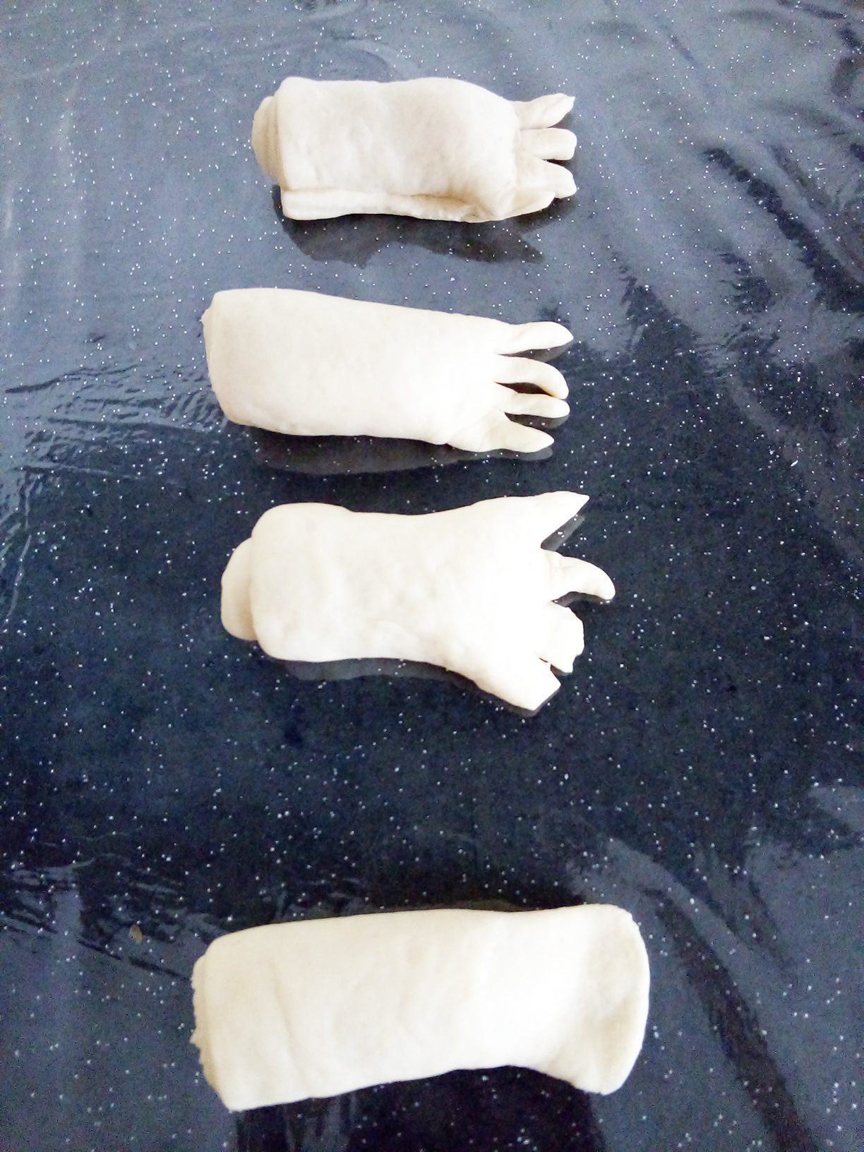 Trascorso il tempo necessario, riprendere l’impasto, sgonfiarlo, lavorarlo delicatamente sul piano di lavoro e iniziare a stenderlo come in figura, ritagliare i bordi laterali della sfoglia e arrotolarli in modo da formare le zampe del nostro coccodrillo.