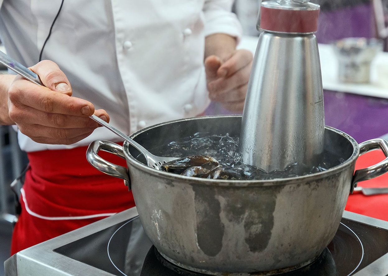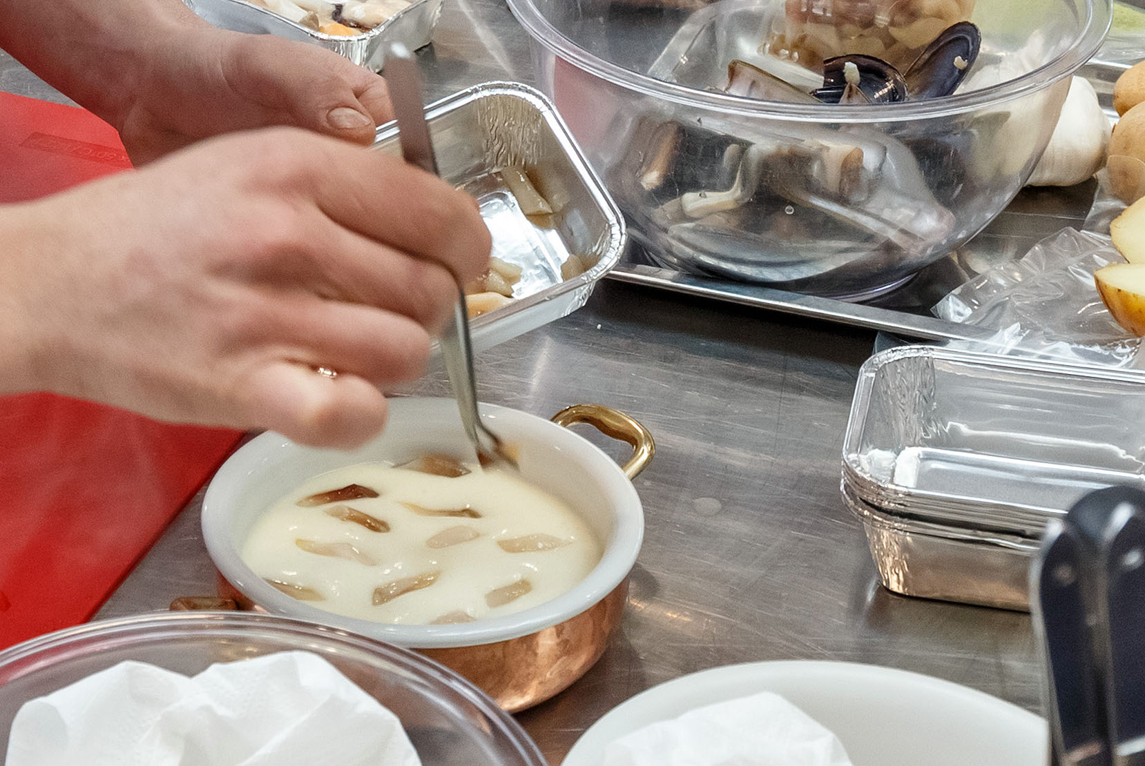 Cuocere le patate in un litro d’acqua con una presa di sale grosso; a fine cottura frullare le patate aggiungendo brodo vegetale e l’acqua di vegetazione di cozze e cannolicchi.