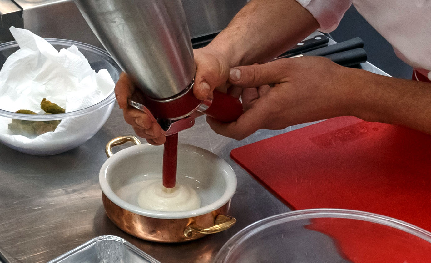 Mettere la crema di patate nel sifone e caricare con 2 cariche di azoto.