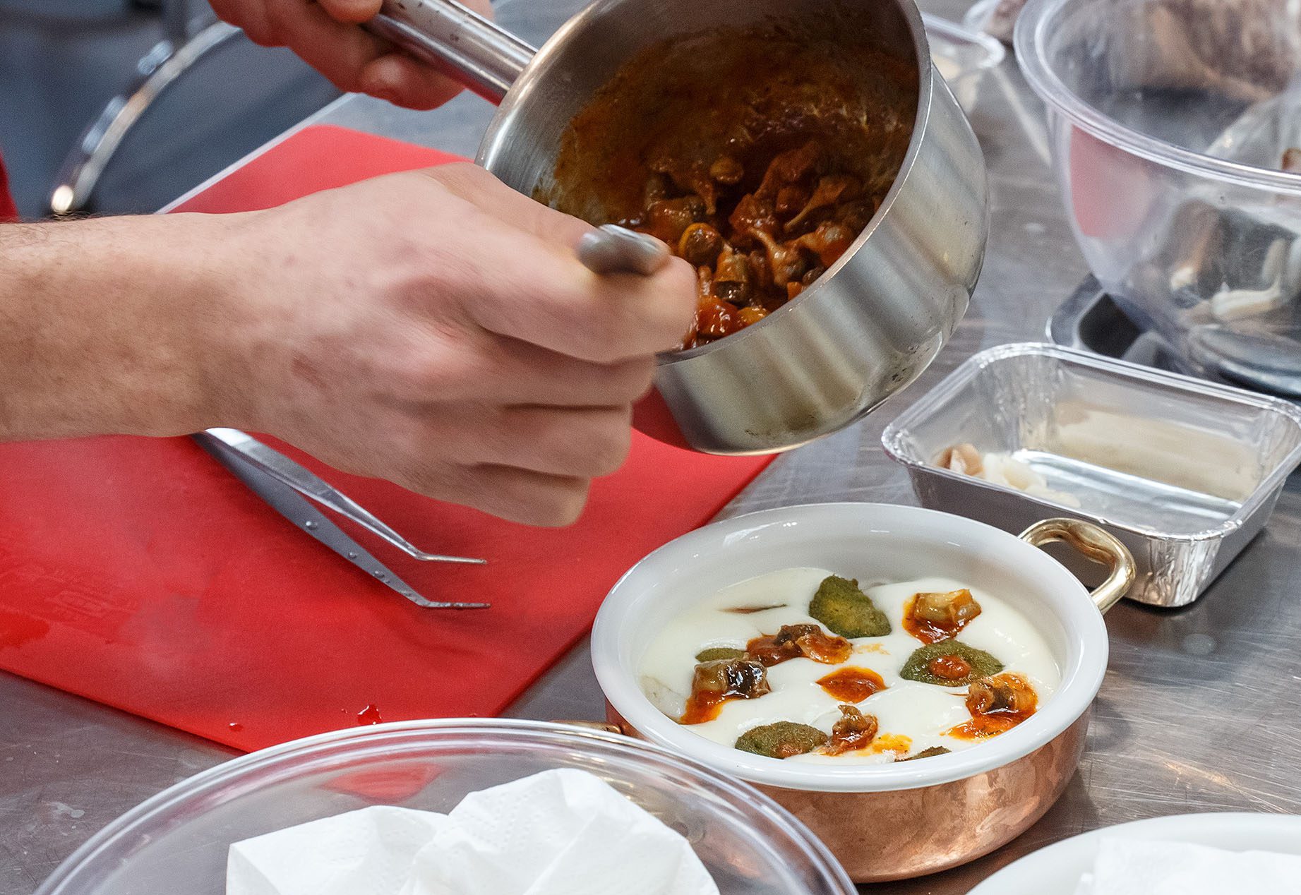 Disporre sul piatto la crema di patate (ottenuta con il sifone), adagiare i cannolicchi, i murici e le cozze fritte. In seguito salsare con il sugo in porchetta e decorare con qualche foglia di finocchio selvatico.