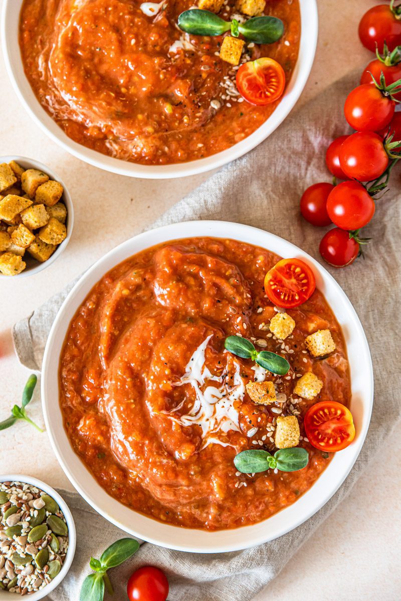 La crema di peperoni e pomodori arrostiti è una squisita vellutata a base di verdure estive e super saporita, ottima sia calda che fredda.