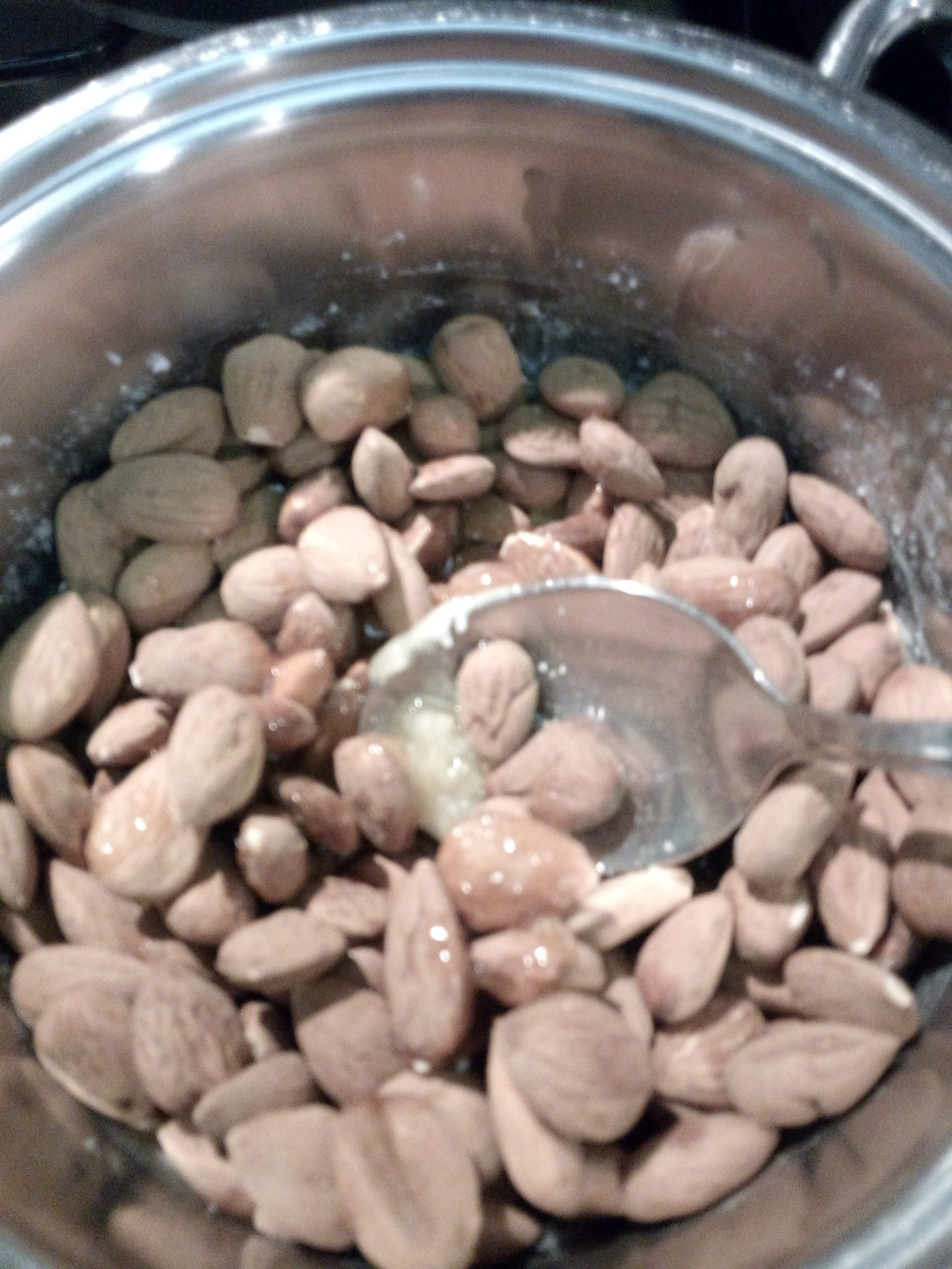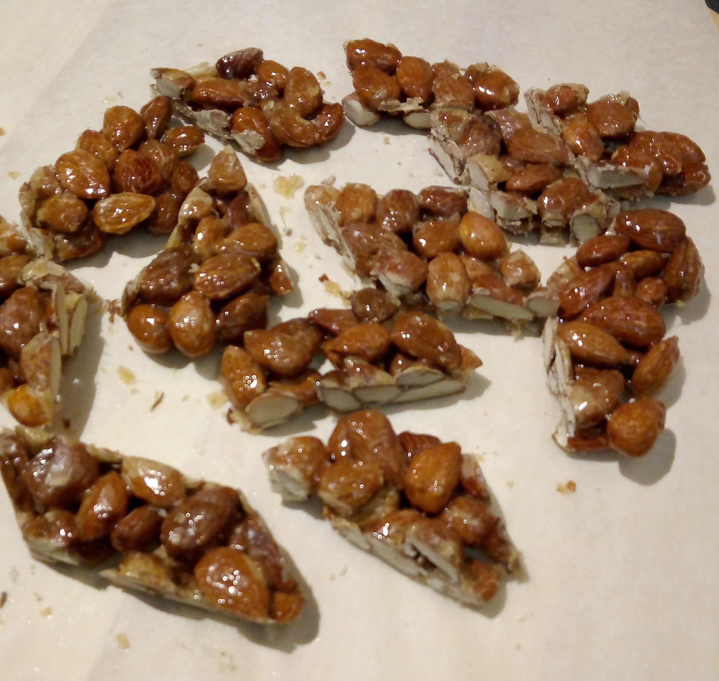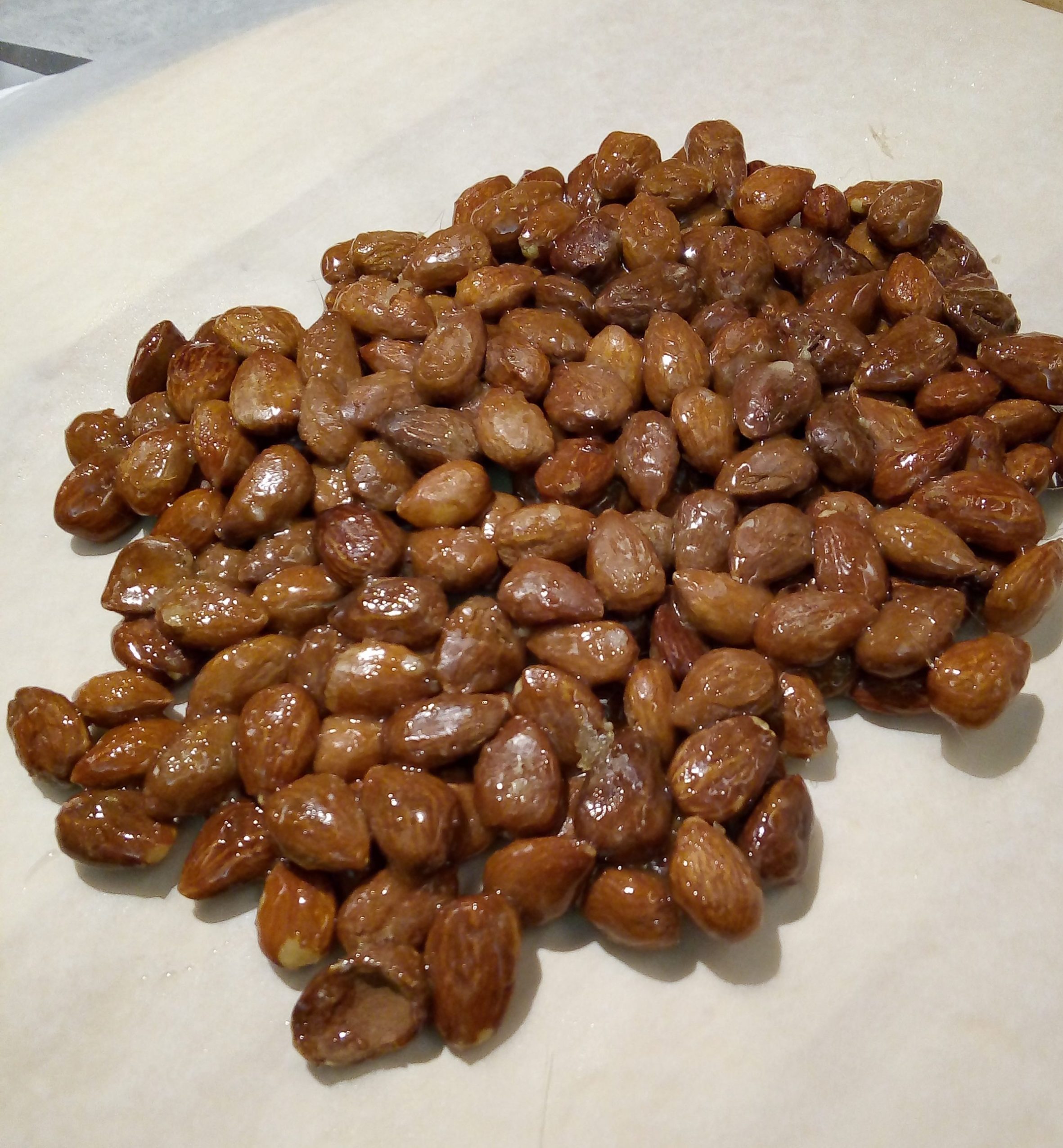 Appena inizierà a caramellare, spegnere il fuoco, versare velocemente le mandorle calde, mescolare bene e poi rovesciare il tutto su un foglio di carta forno leggermente oleato.