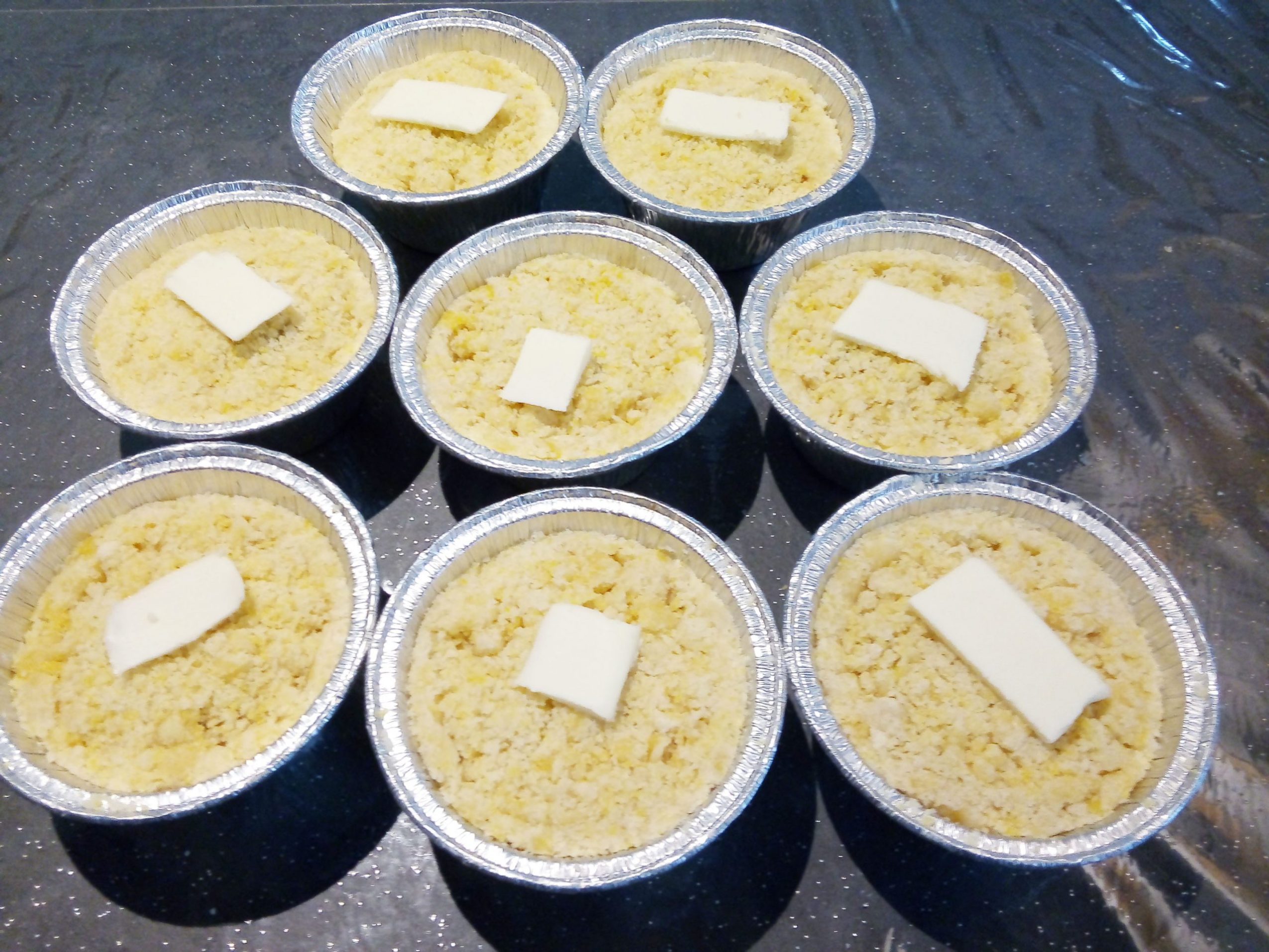 Al termine della preparazione, prima di infornare, mettere un sottile velo di burro sopra ogni tortina, come in foto.