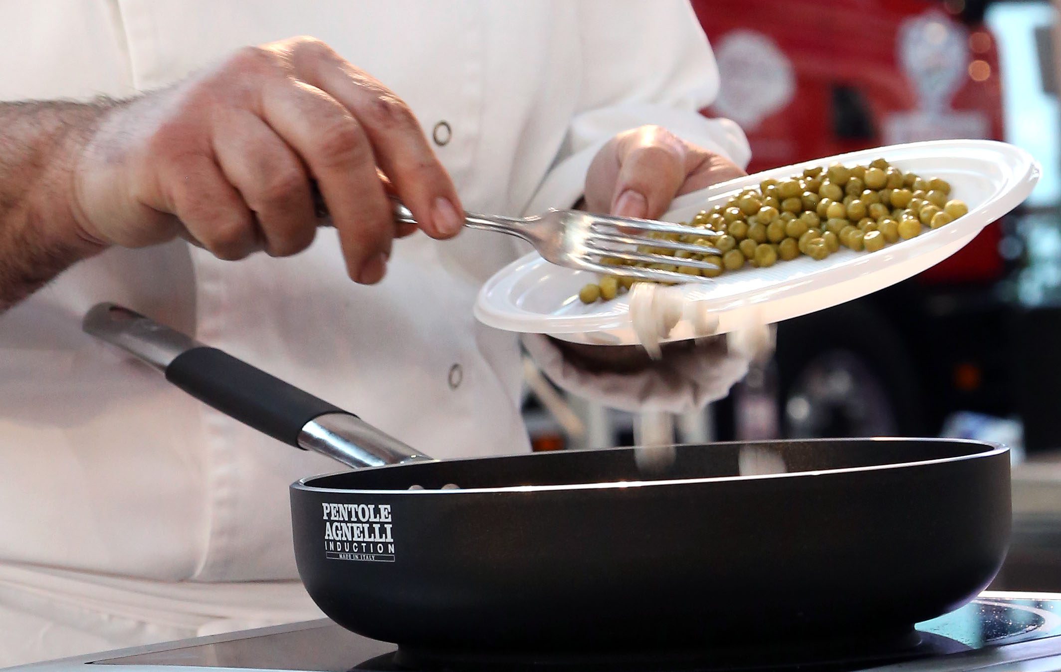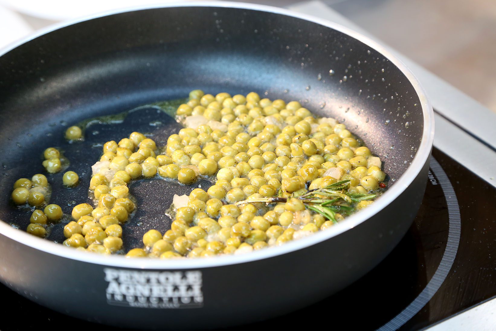 In un pentolino far rosolare una cipolla piccola finemente tritata. Dopo qualche minuto, unire il lardo e i piselli, condire con del sale e aggiungere il timo.