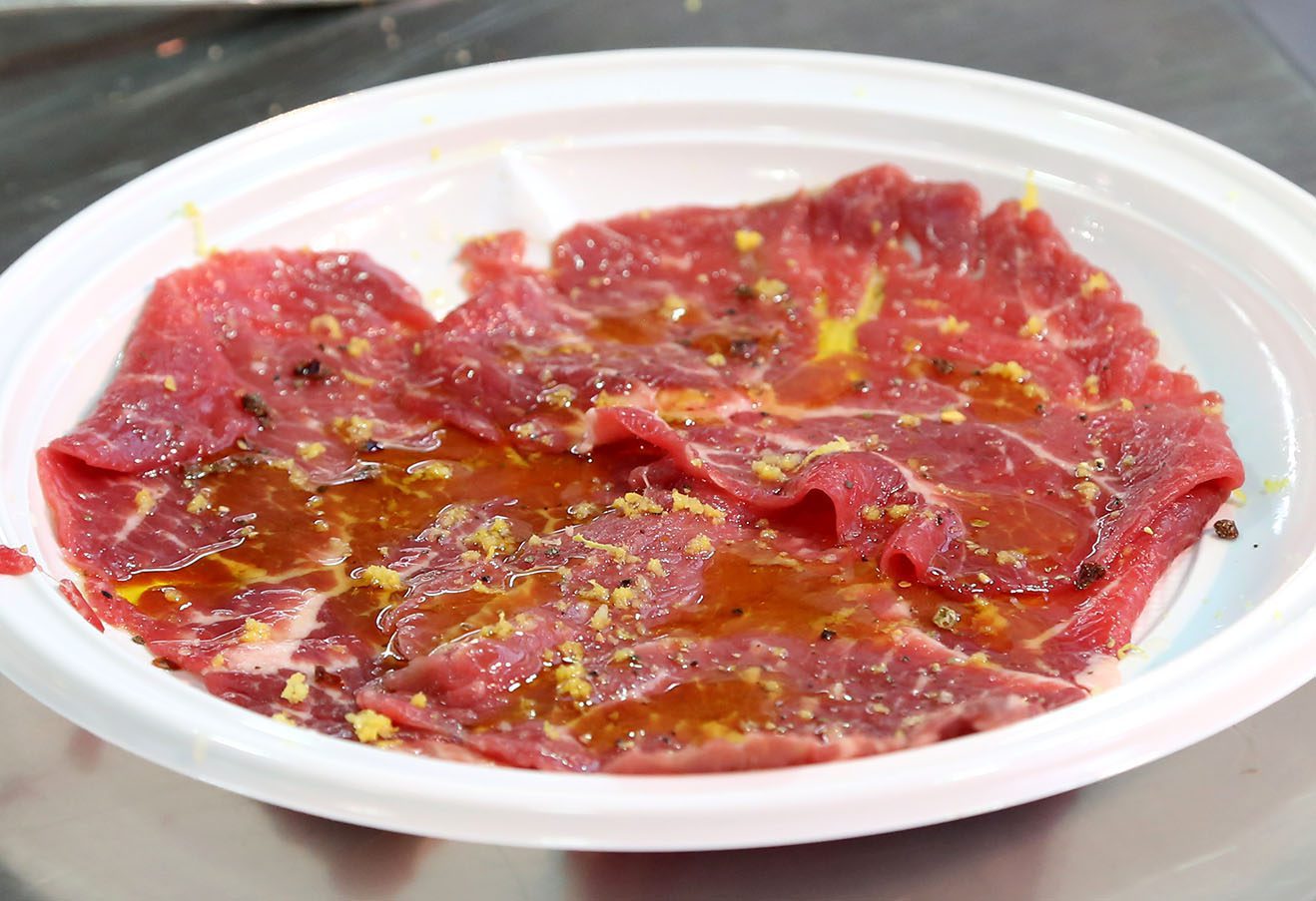 Dopo aver affettato la fesa di manzo, porla in un vassoietto e condirla con olio extravergine d’oliva nocellara, del pepe, del sale, la buccia di limone grattugiata e il succo di arancia. Lasciare marinare il manzo per circa 2 ore.