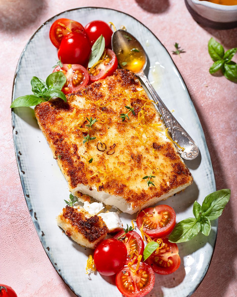 La feta, un formaggio greco a base di latte di pecora o capra, diventa ancora più cremosa e morbida quando viene cotta in forno. L’aggiunta del miele conferisce poi una dolcezza delicata che si unisce con la sapidità del formaggio, creando un perfetto equilibrio. Per rendere il piatto ancora più aromatico, abbiamo poi aggiunto timo fresco, foglie di basilico e scorza d’arancia e pomodorini Ciliegino.
