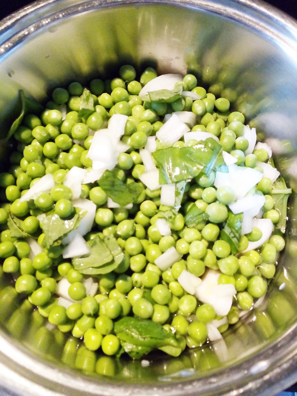 Per prima cosa, in una pentola versare i piselli precedentemente lavati e mescolarli alla cipolla tagliata a pezzetti, aggiungere le foglie di basilico, il pepe fresco, il sale, un filo d’olio e un bicchiere d’acqua.