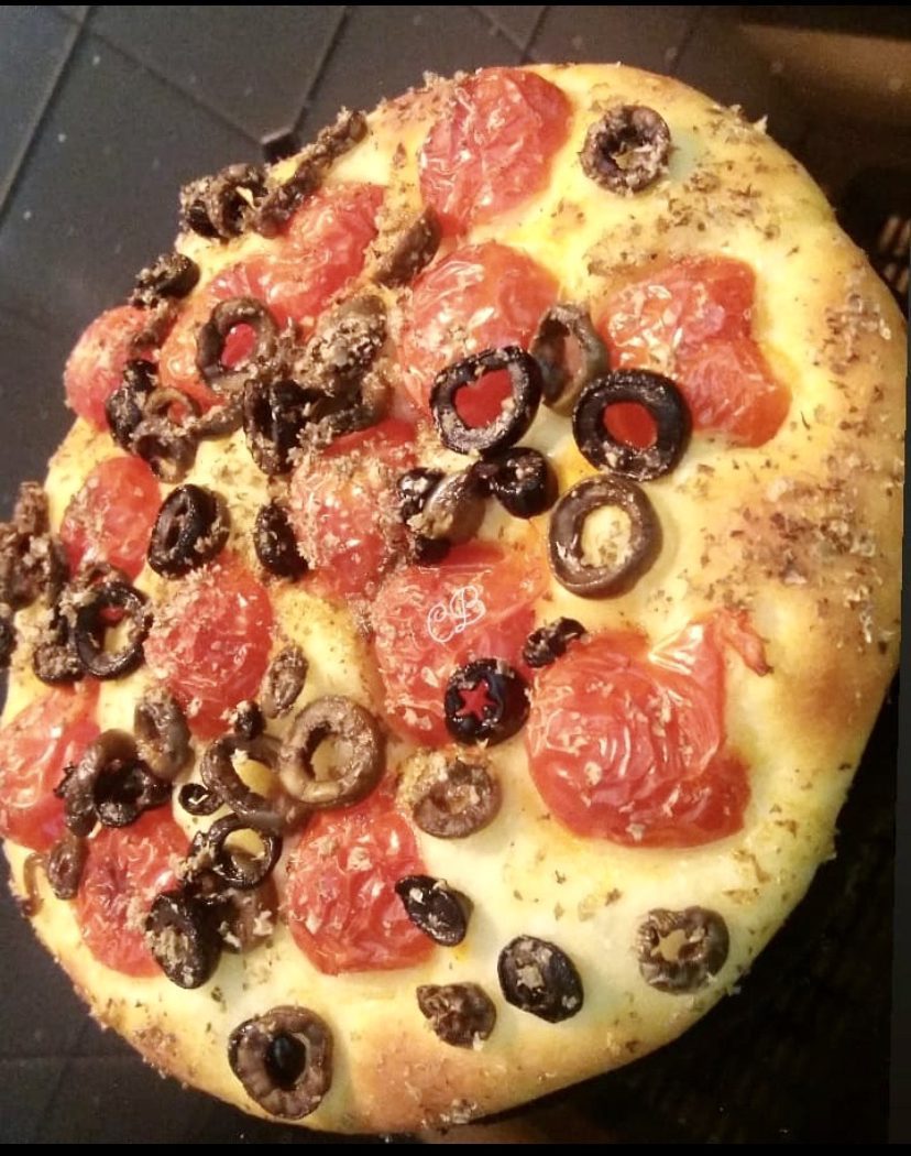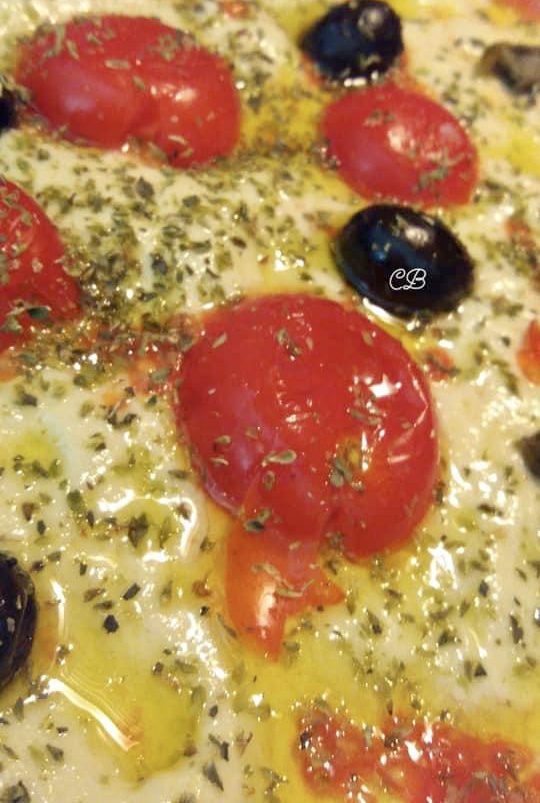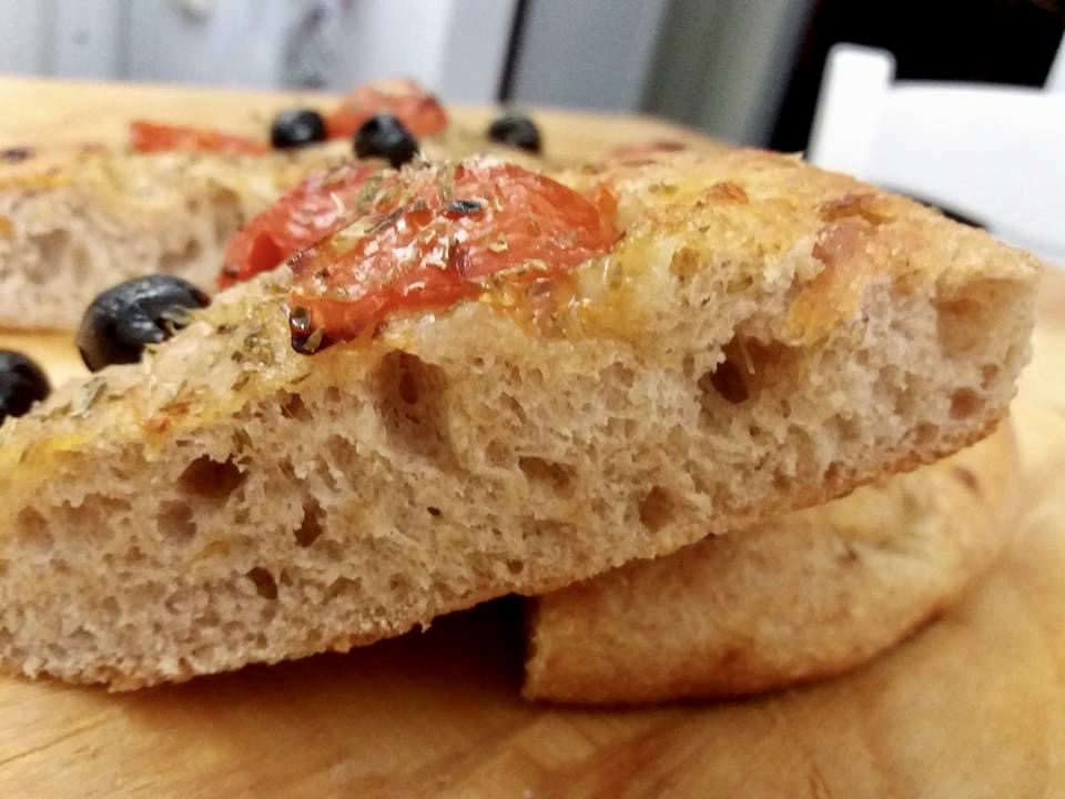 Oltre a condire la focaccia con pomodorini, olive nere e origano, si possono usare anche carciofi e filetti di acciughe.
