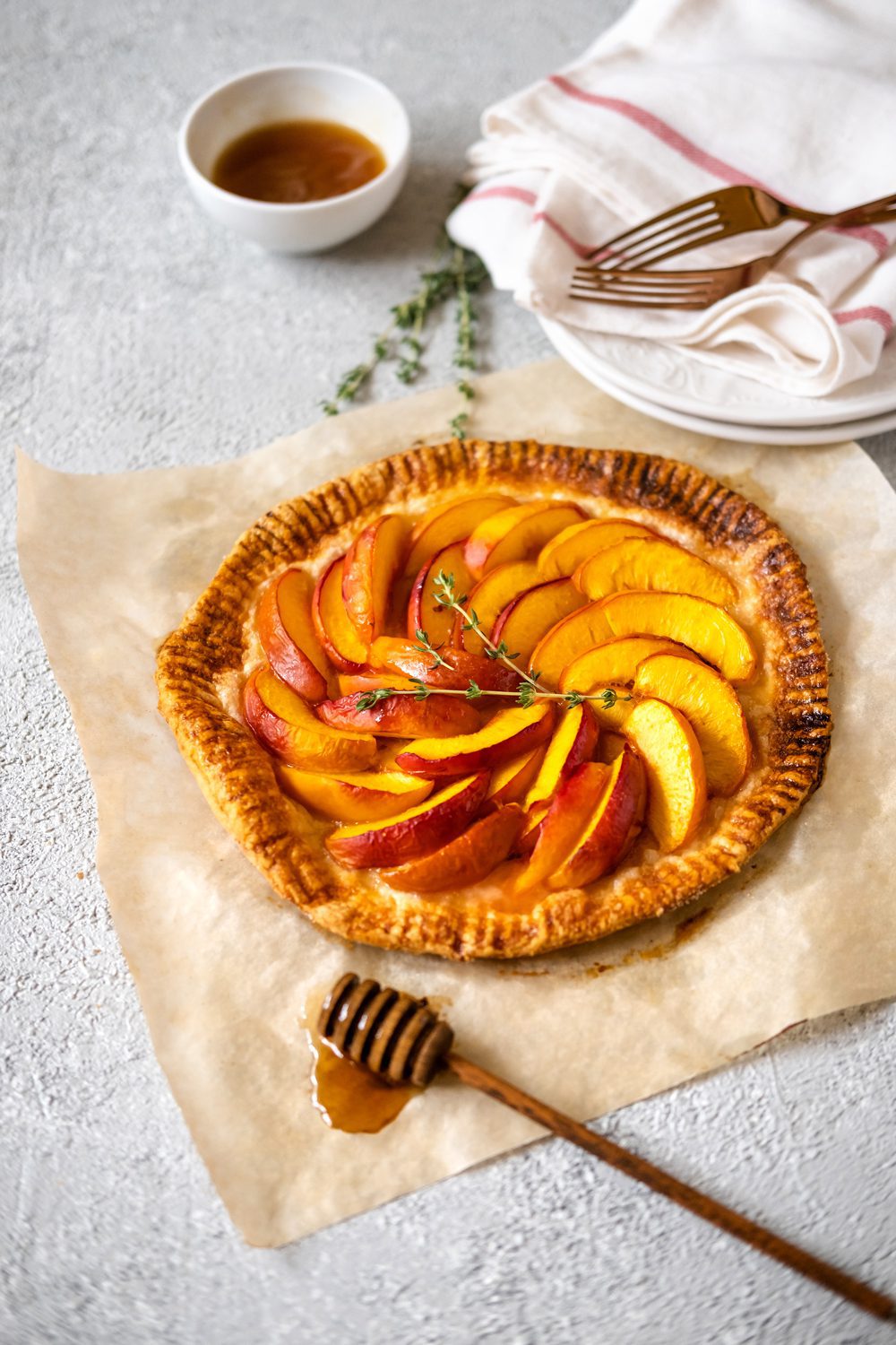 L’impasto per la galette è molto semplice e viene preparato con una combinazione di farina 0 e farina integrale, burro freddo e poco zucchero. Per il ripieno, le pesche nettarine sono le protagoniste assolute. Questo frutto succoso viene tagliato a fette sottili e distribuito sulla superficie dell’impasto. Per esaltarne ulteriormente il sapore, viene aggiunta anche della marmellata di pesche, che si fonde con la frutta durante la cottura, creando una deliziosa armonia di dolcezza. Infine, il miele viene versato sulle pesche, donando un’ulteriore nota dolce e profumata che si abbina perfettamente con il gusto delicato della frutta.
