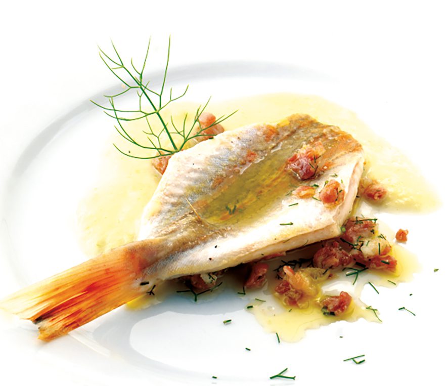 La gallinella di mare in porchetta, servita su una purea di finocchio è un ottimo secondo piatto di mare della chef Elide Pastrani.
