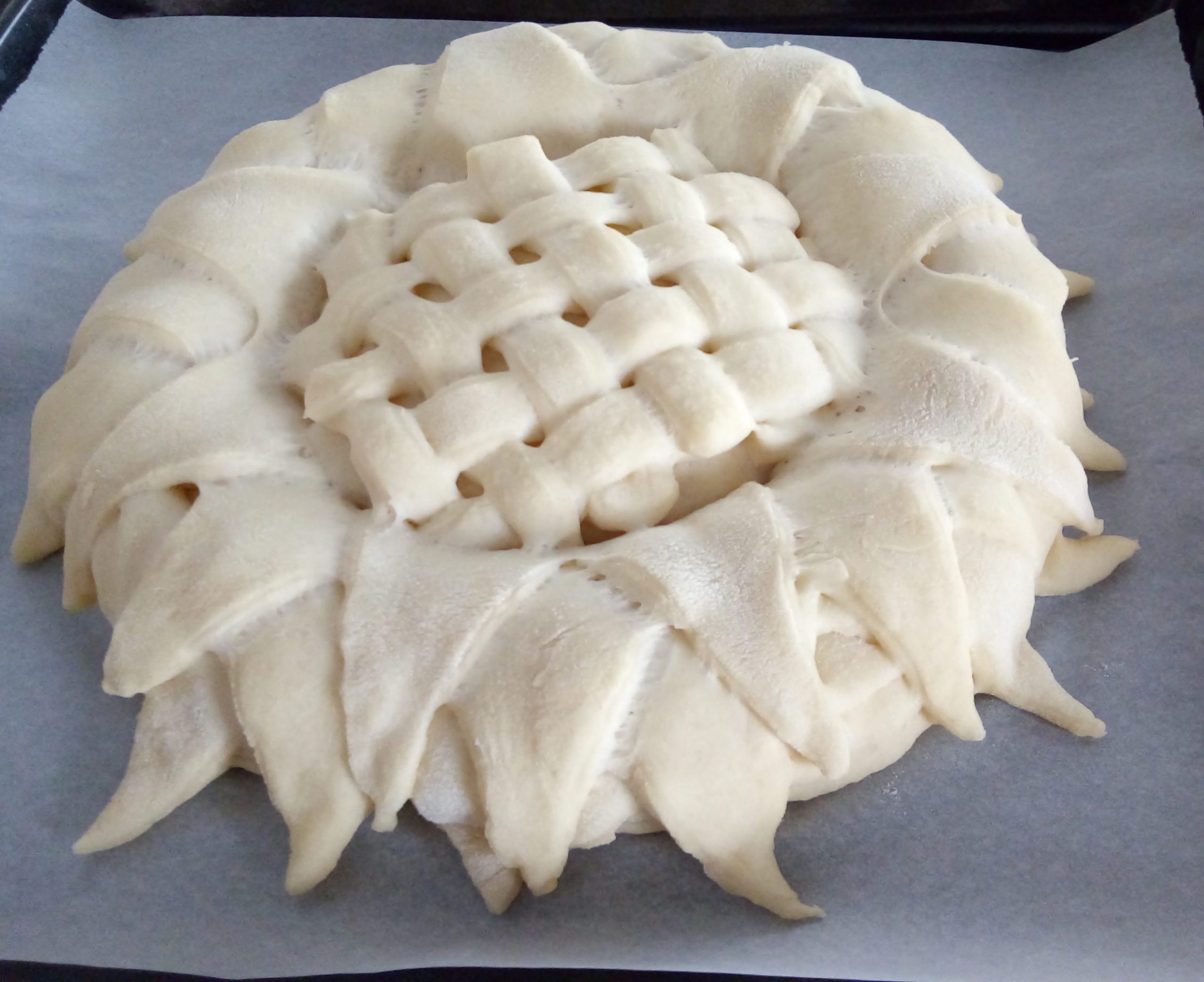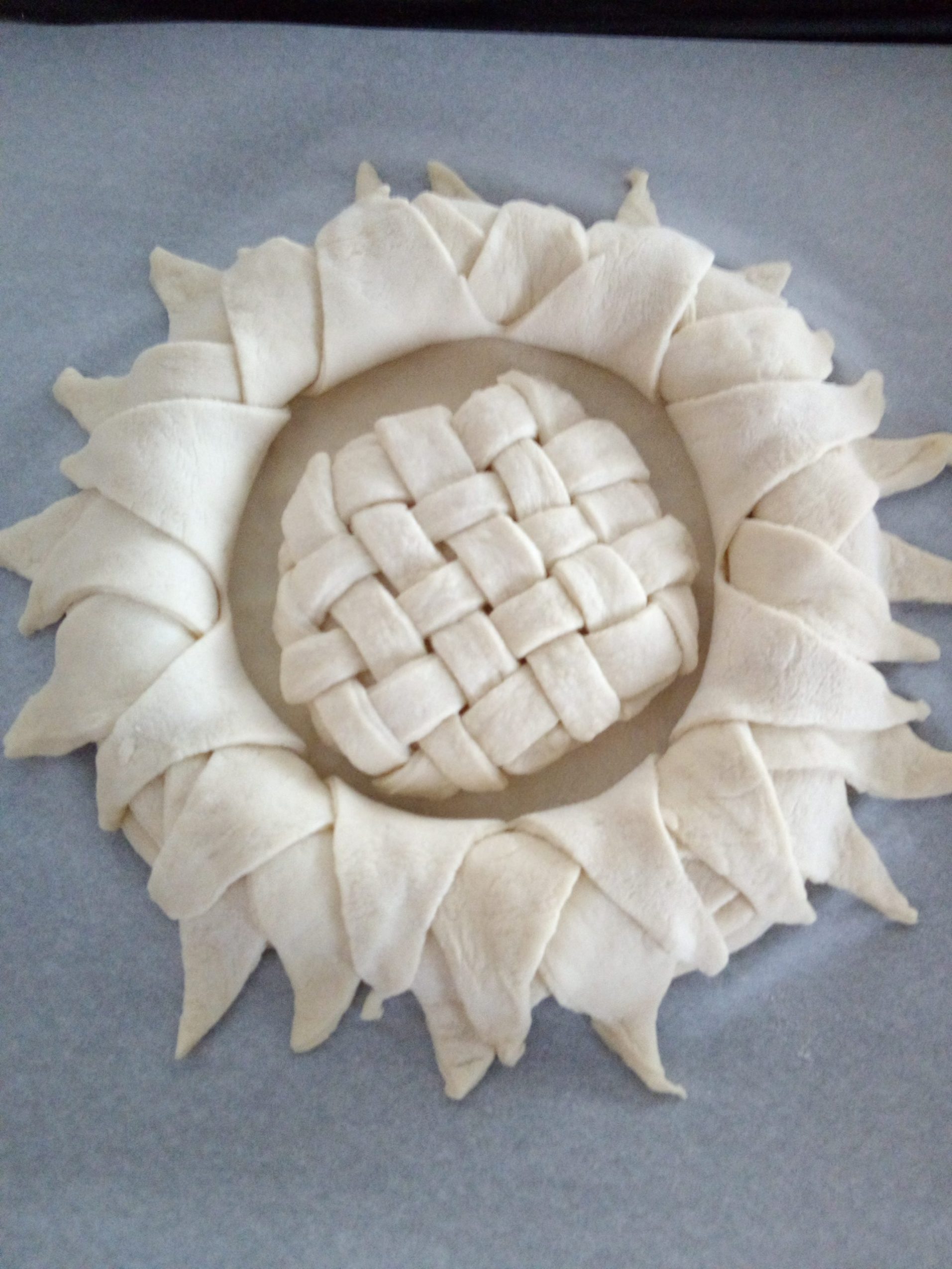 Stendere ogni pezzo in un disco, disporre il primo, che sarà la base del girasole, sulla lastra del forno, il secondo verrà sovrapposto al primo dopo aver praticato al centro un taglio a croce da formare 4 spicchi che a loro volta saranno suddivisi nuovamente fino a formare 8 spicchi lasciando il bordo esterno intatto.