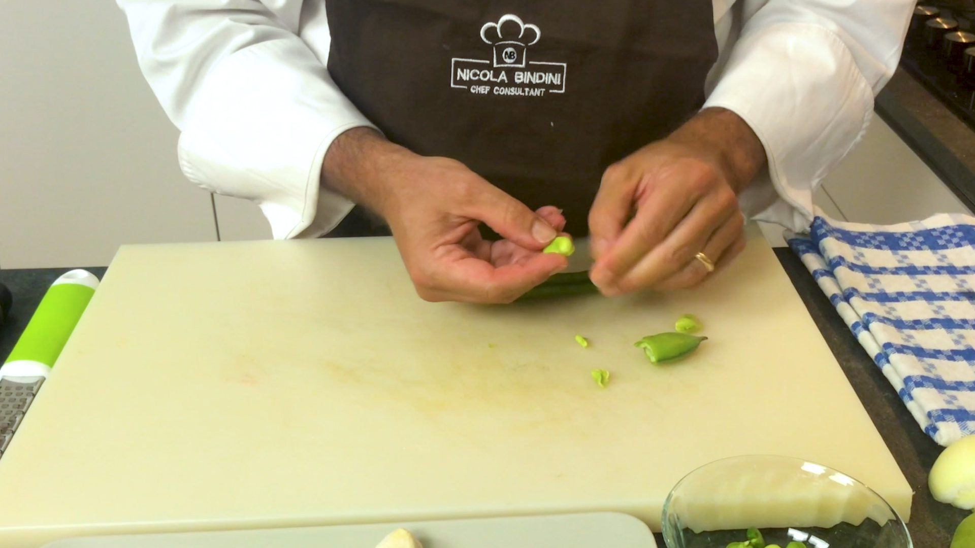 Cominciamo sbucciando le fave, poi tritiamo finemente la cipolla.