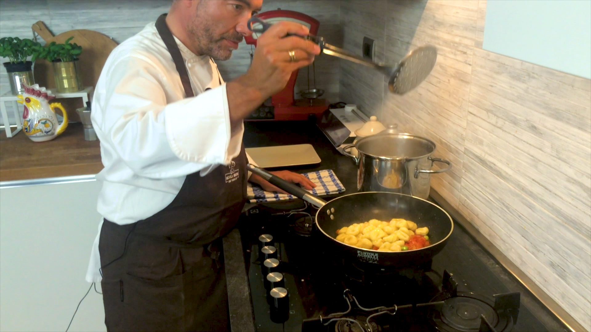 Per mantecare, teniamo da parte l’acqua di cottura; accendiamo il fuoco sotto la padella, versiamo l’acqua di cottura e facciamo saltare gli gnocchi.