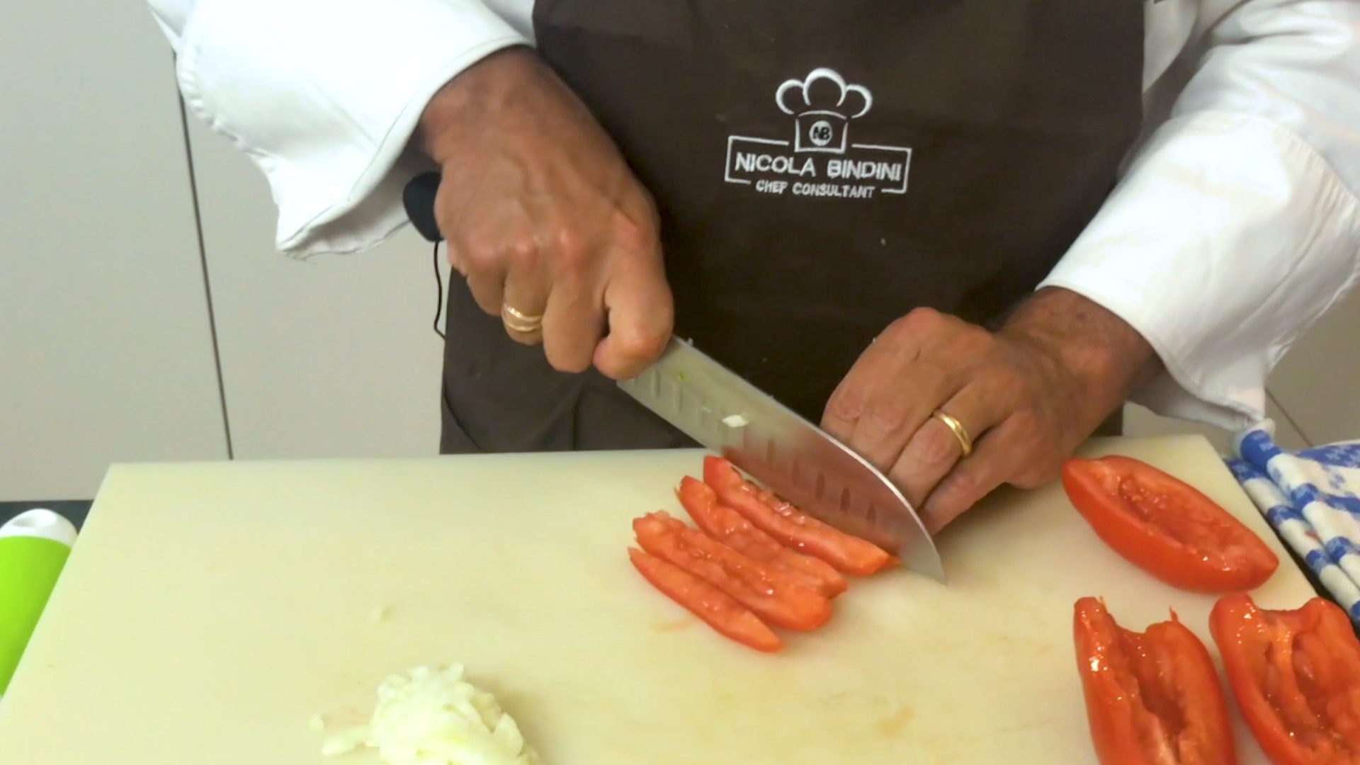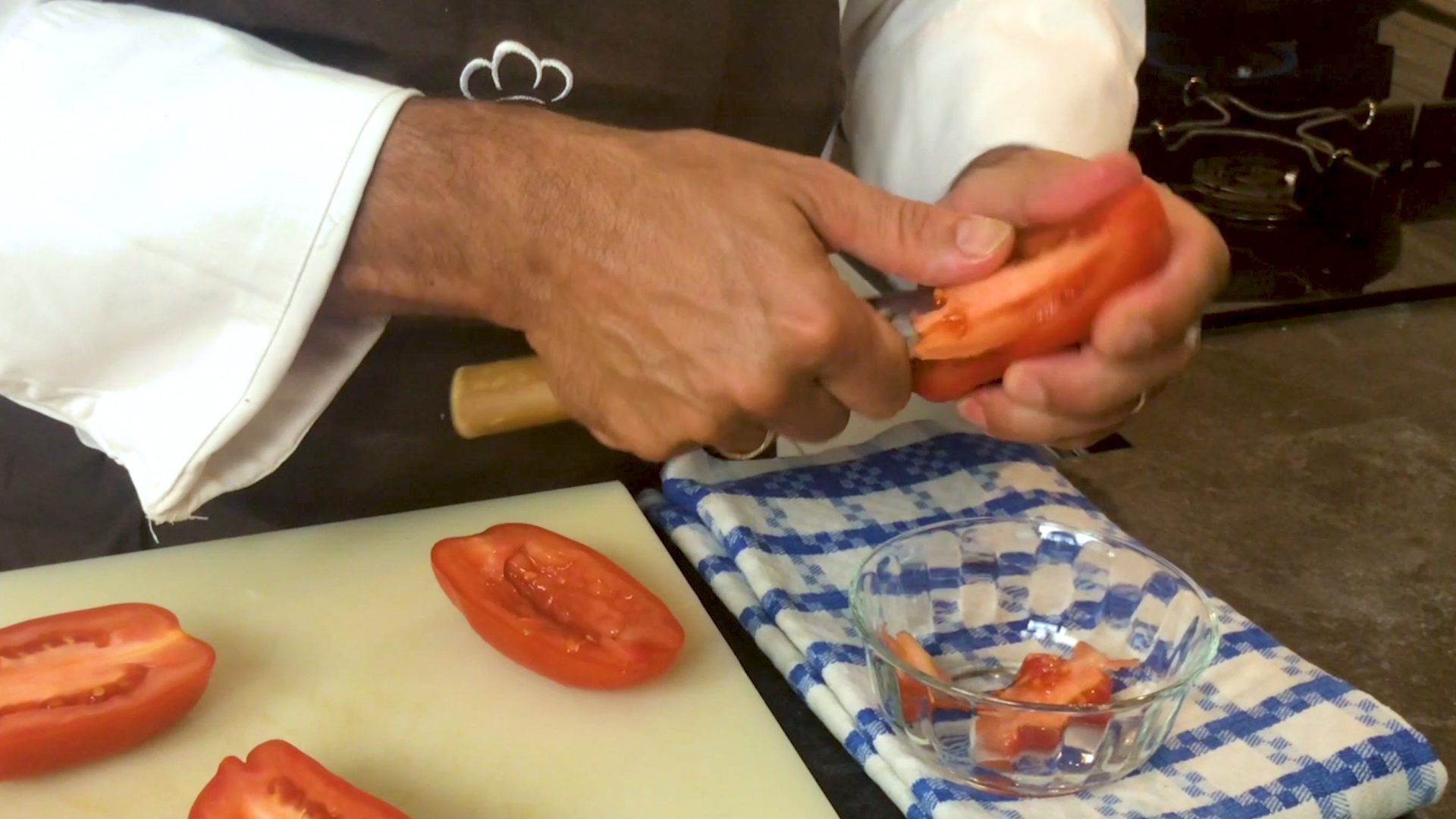In seguito prendiamo i pomodori, li apriamo a metà e li priviamo dei semi utilizzando un coltellino. A questo punto tagliamoli a cubetti.