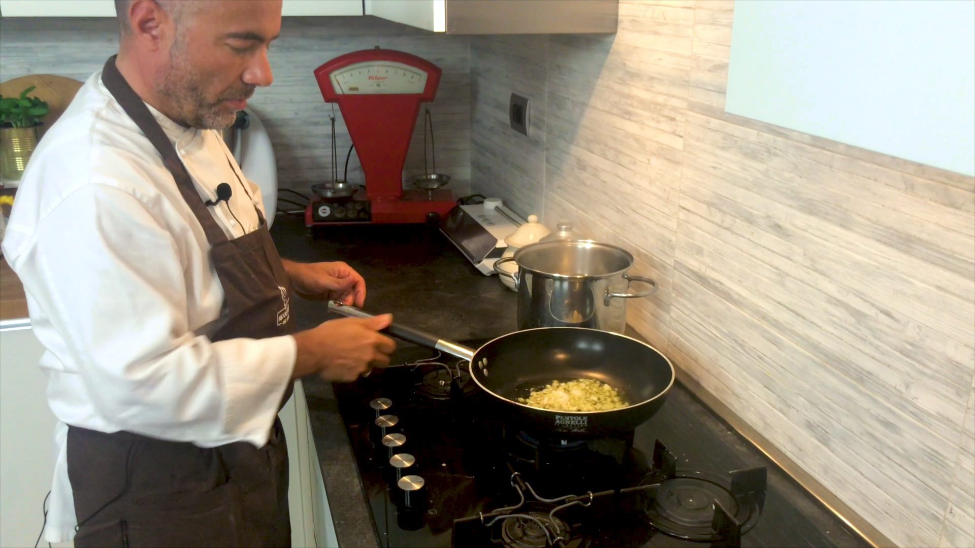 Scaldiamo l’olio a fuoco dolce in una padella, poi uniamo la cipolla e l’aglio.