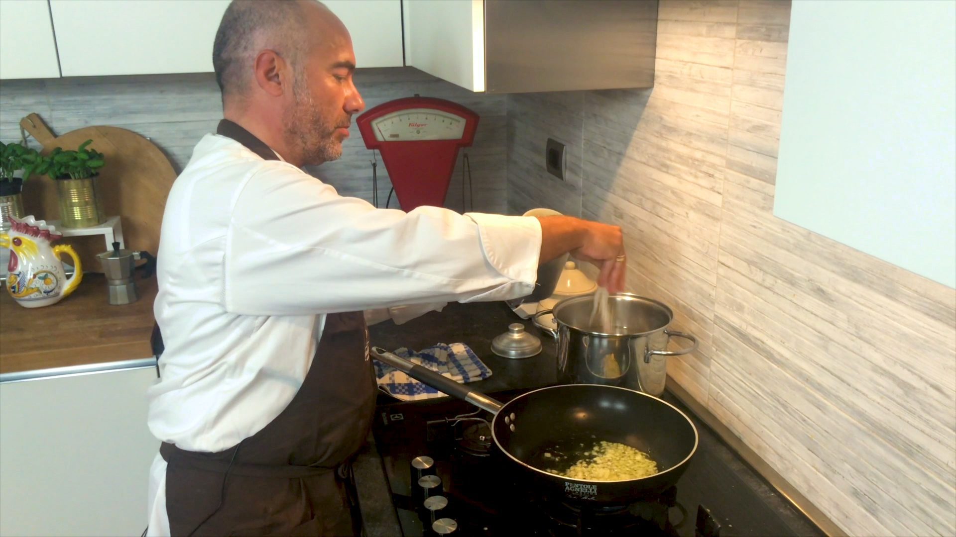 Con la ramina creiamo un vortice che vada a mescolare la pasta, senza che si attacchino tra loro.
