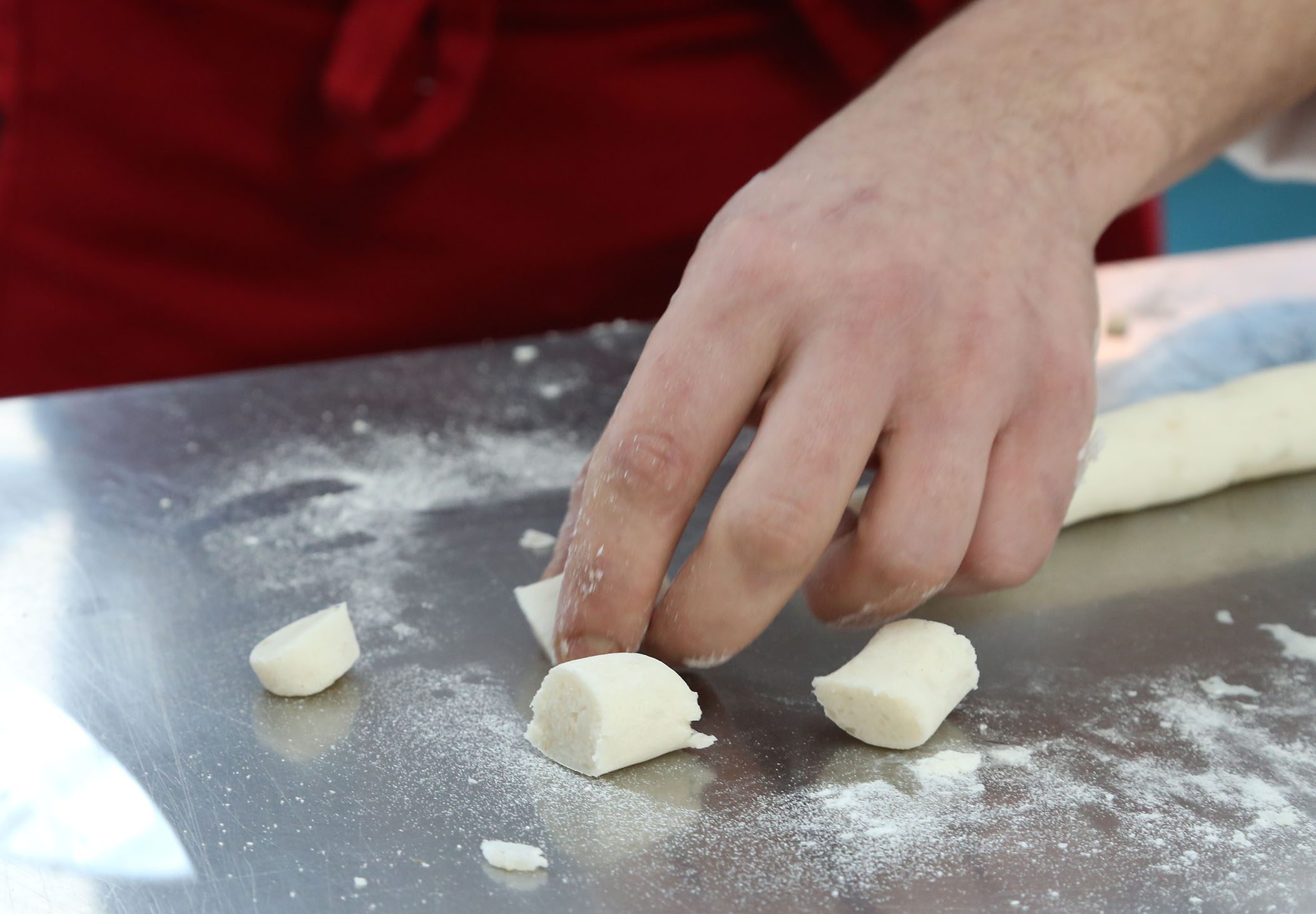 cuocere in acqua salata la tapioca per circa un’ora, pelarla e schiacciarne la polpa; fare raffreddare il tutto. Impastare 500 grammi di tapioca con 75 grammi di farina, stendere l’impasto in una spianatoia, tagliare una porzione di impasto e, con le mani, formare dei cilindri allungati: tagliarli e formare gli gnocchi.