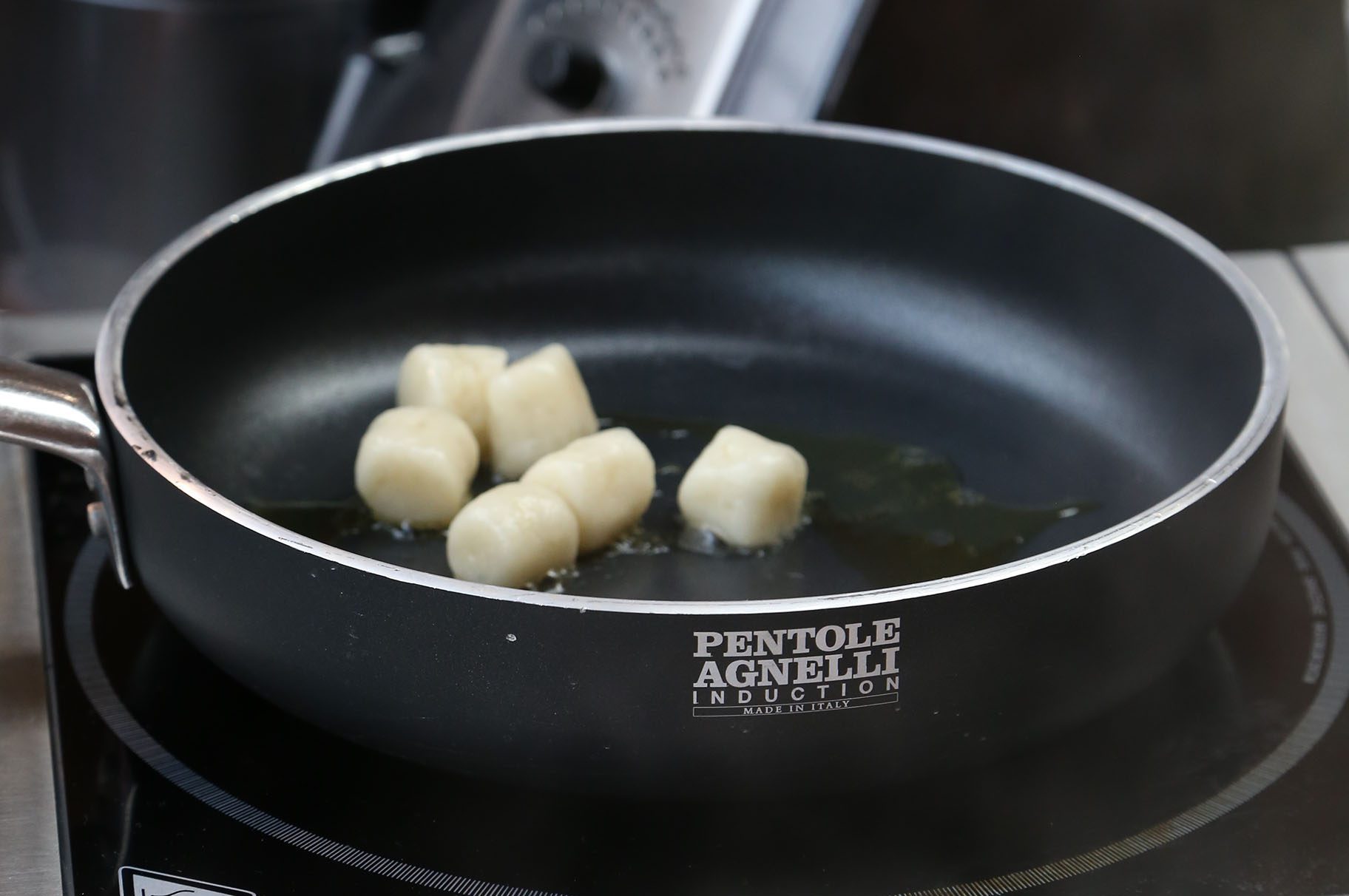 Sbollentare gli gnocchi di tapioca, scolarli e rosolarli in padella con un po’ d’olio; a parte rosolare da ambo le parti i fiori di zucca farciti.