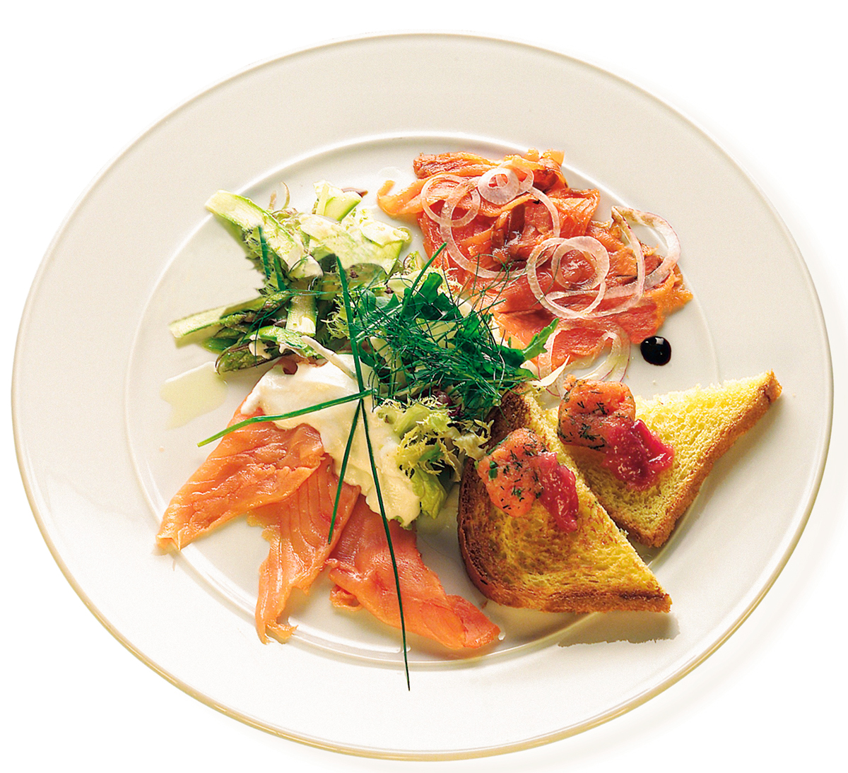 Al centro del piatto adagiare gli asparagi precedentemente sbollentati e poi tagliati longitudinalmente con dell’insalata condita con olio, sale e pepe a proprio piacimento.