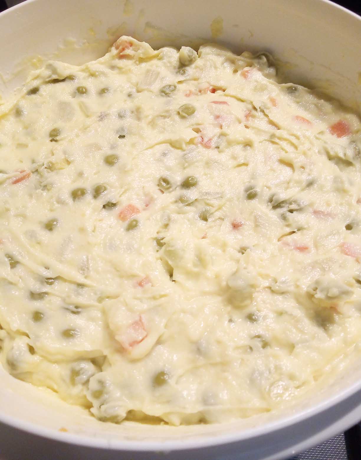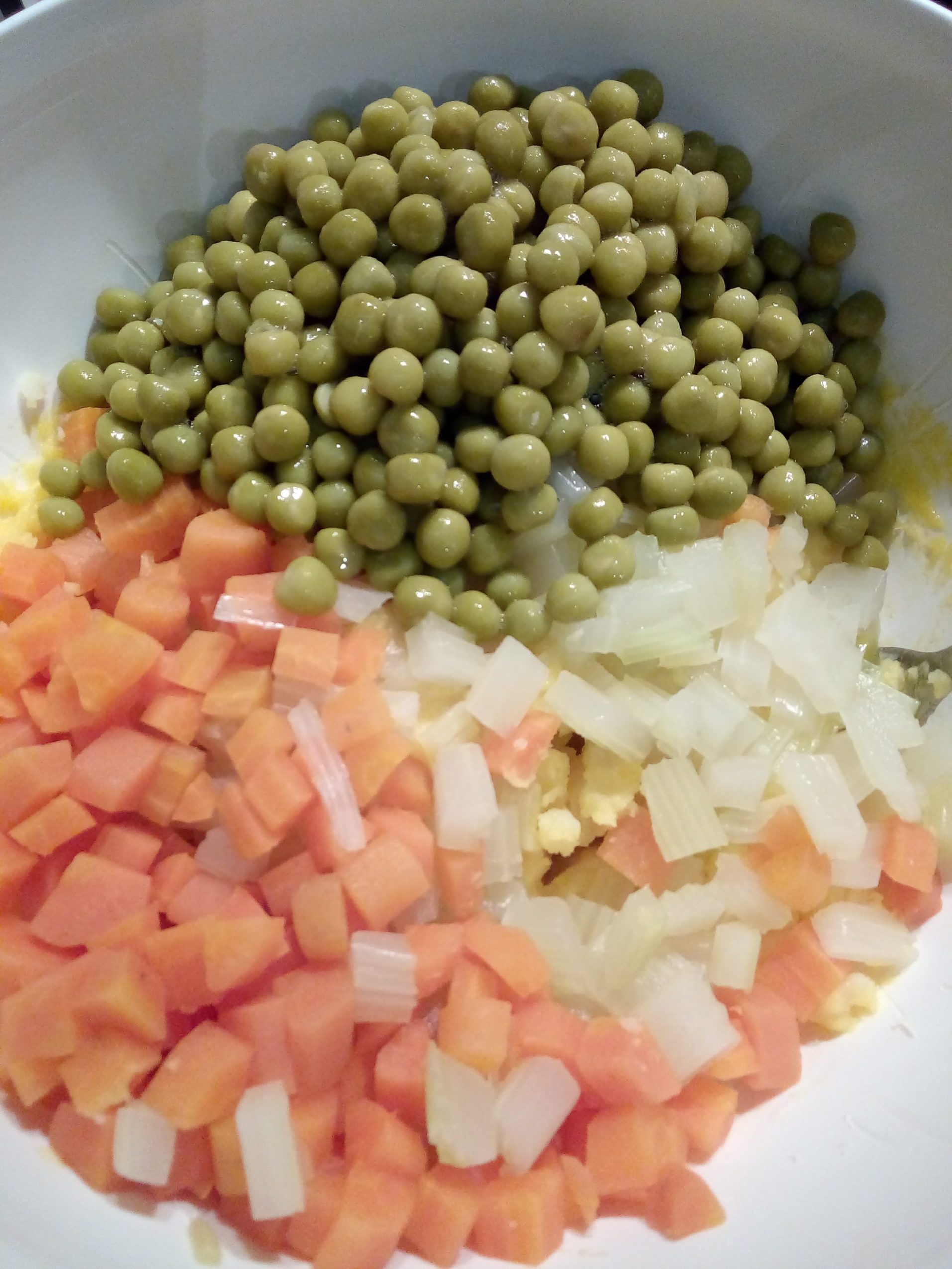 In un secondo momento, mescolate i tuorli con le patate raffreddate, aggiungete le carote, il sedano e i piselli scolati dall’acqua.
