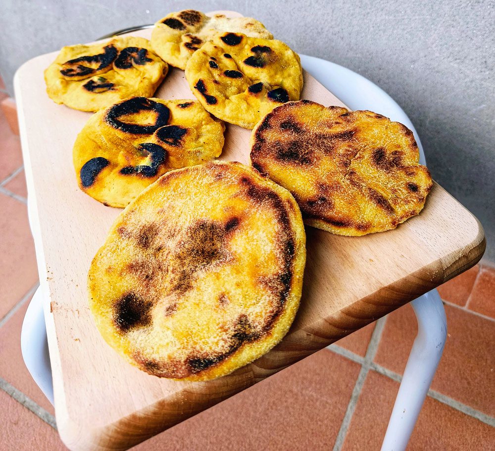 La cottura tradizionale viene fatta su una stufa a legna, ma vengono benissimo anche in padella antiaderente (meglio ancora, se l’avete, una padella in ferro). Quando la padella è ben calda, adagiare i dischi di impasto e cuocere brevemente da entrambe le parti.