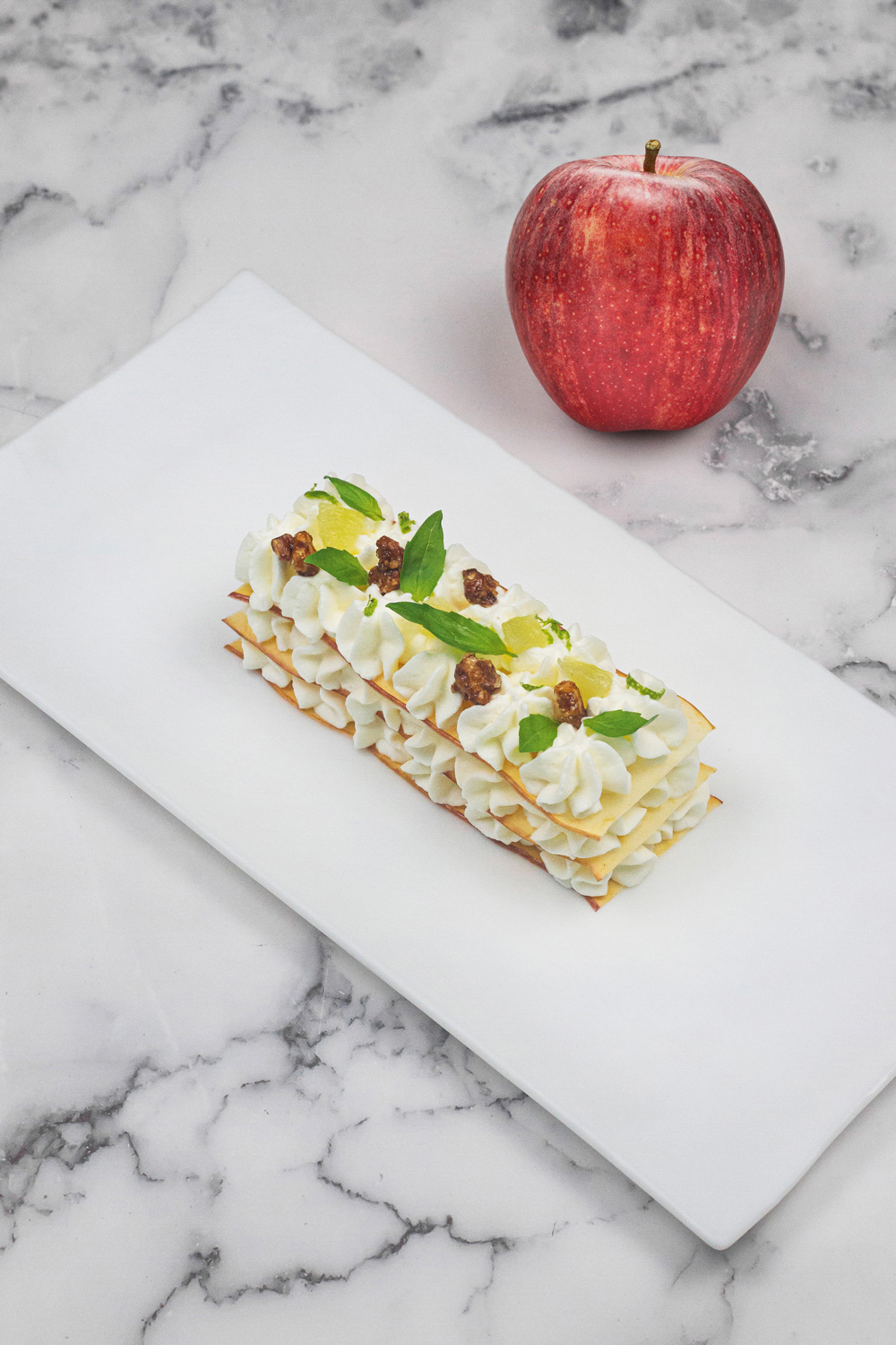 Millefoglie di mele Gala caramellate: la tonda Gala ha sentori fruttati e speziati, che ricordano la pera, la pesca e l’anice stellato.