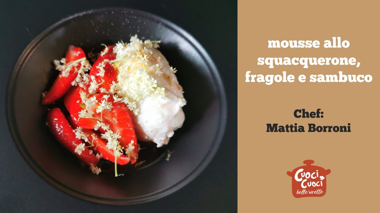 Impiattare facendo due quenelle con la mousse (nel video viene spiegato come si fa la quenelle), adagiarvi accanto le fragole e cospargere di sambuco.