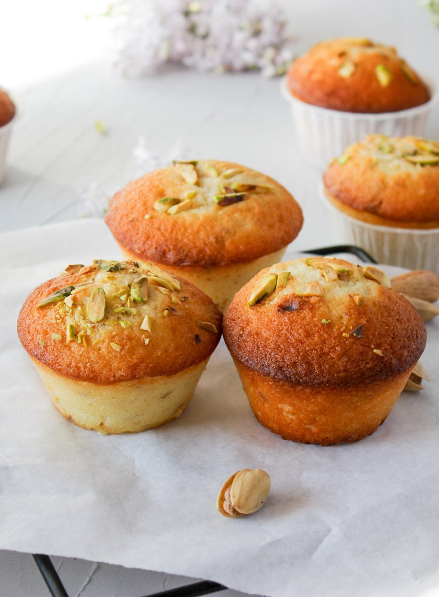 Decorare la superficie con la restante granella di pistacchi e cuocere in forno statico preriscaldato a 180 °C per circa 20 minuti. I muffin dovranno risultare leggermente dorati in superficie.