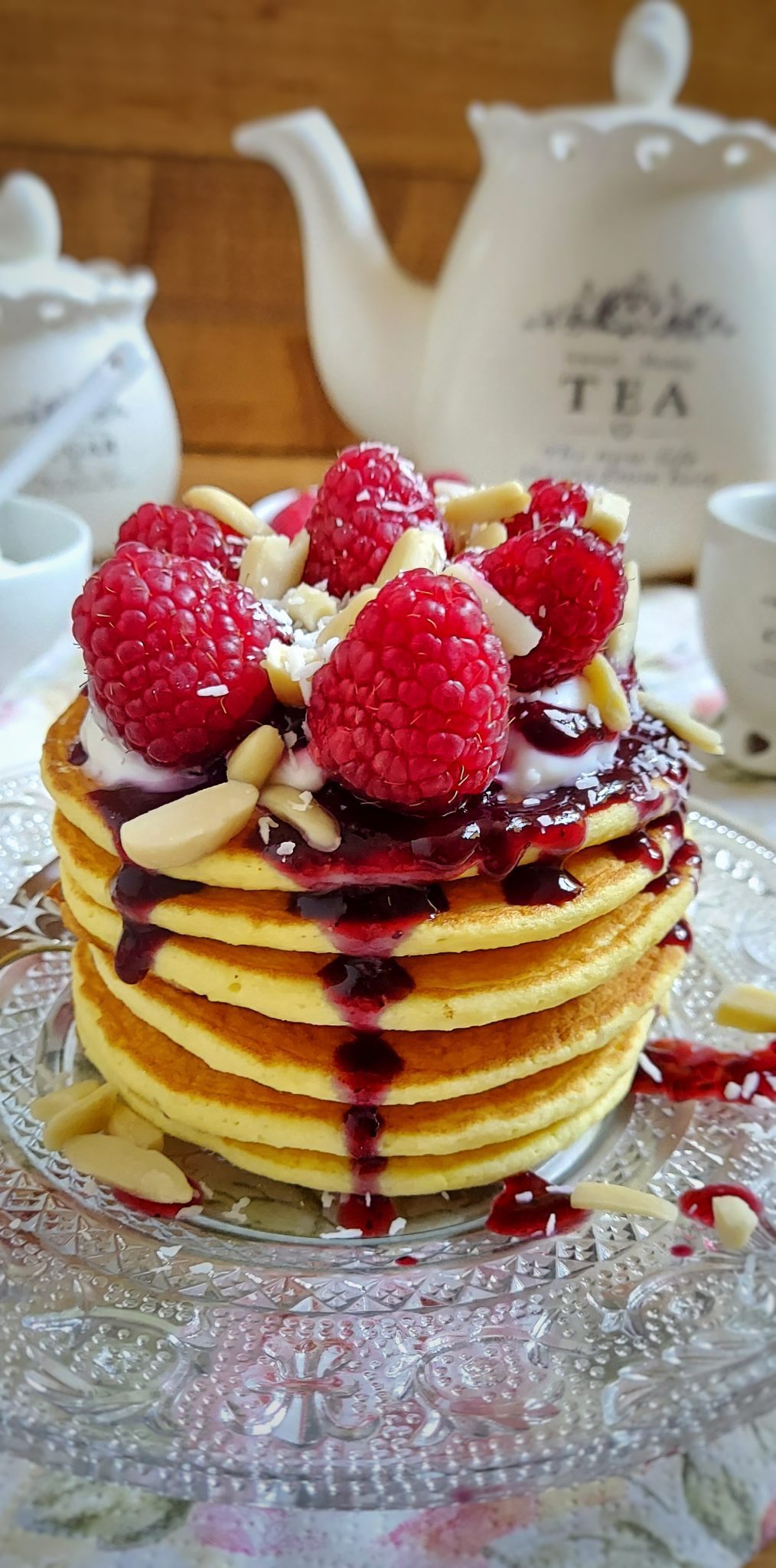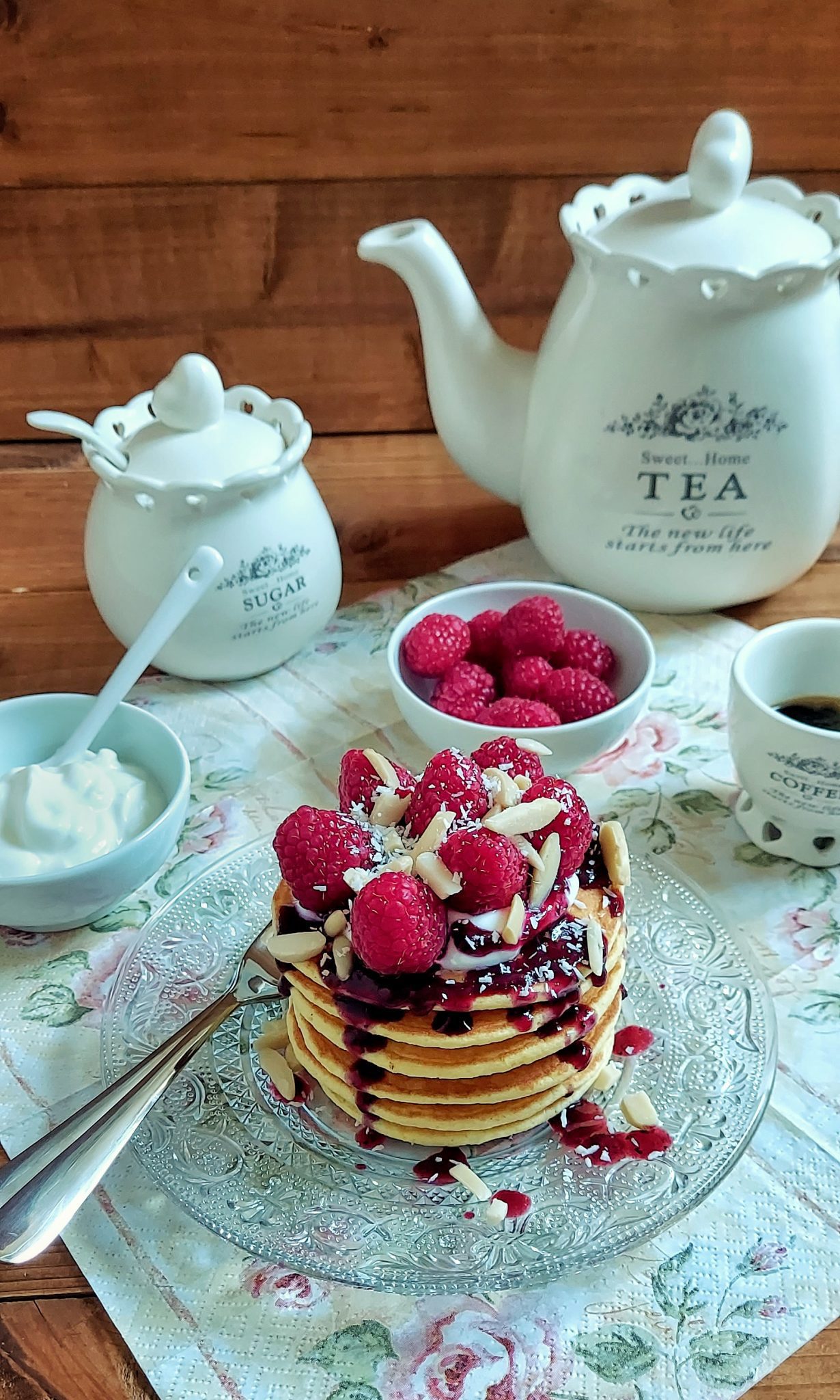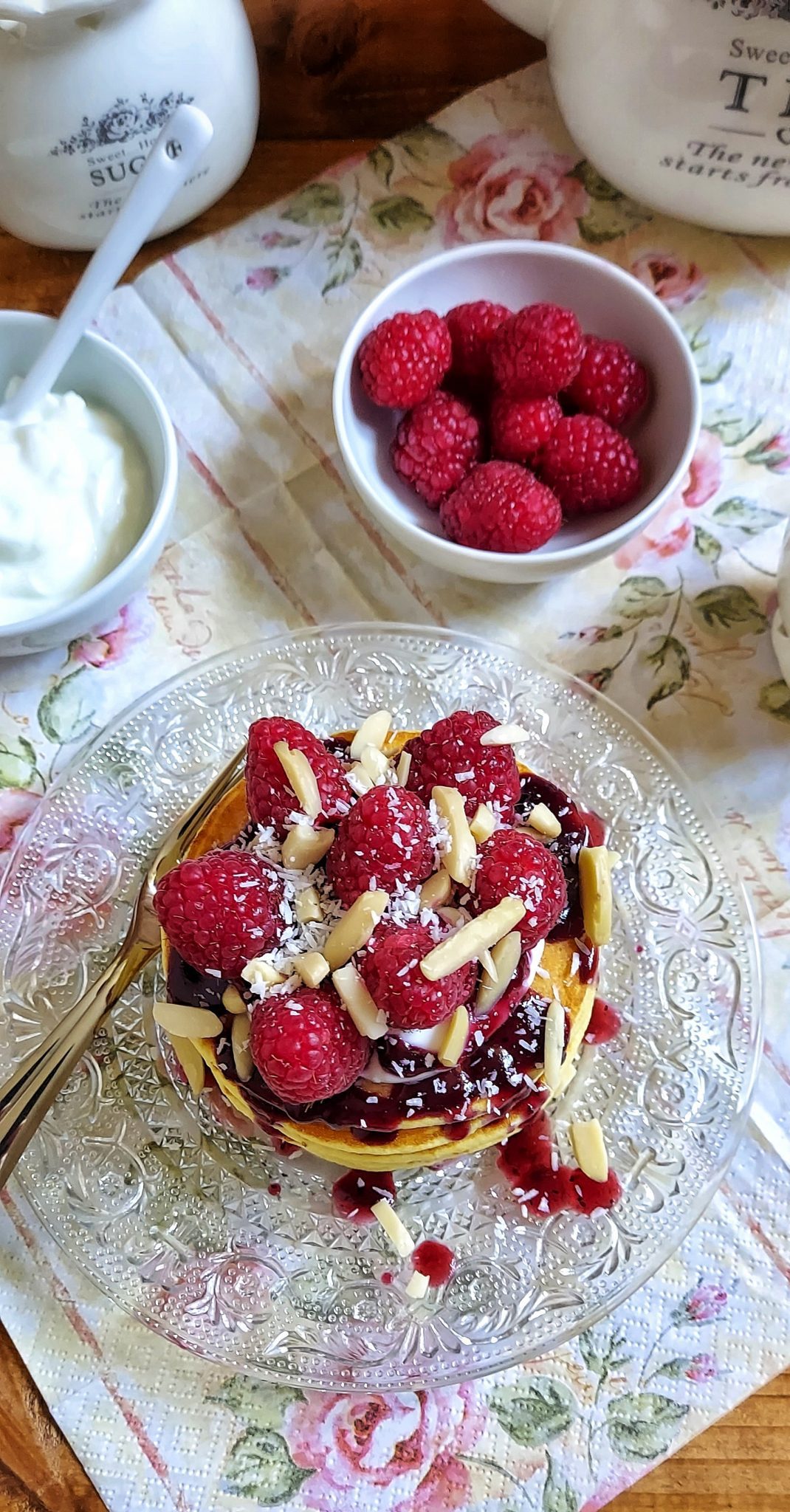 Farcire i pancake a piacimento, ad esempio con della marmellata senza zucchero e con lamponi o mirtilli freschi.
